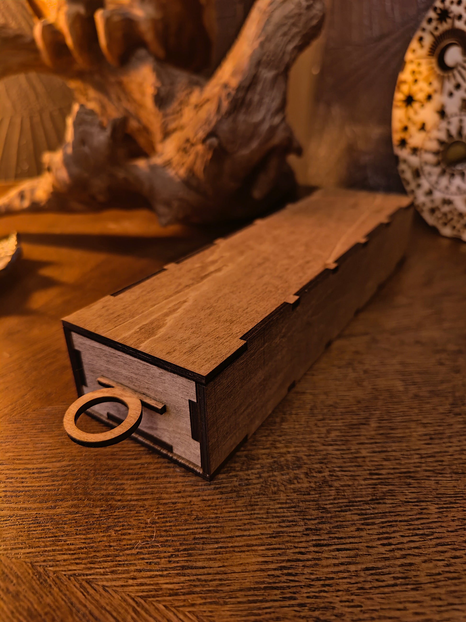 Bring the warm and spicy atmosphere of Christmas into your home or give it as a thoughtful gift. This set includes a handmade storage box crafted from birch plywood, precisely laser-cut and finished with antique wax. The box features a fully removable inner drawer and measures approximately 22 × 6 × 4 cm. It is perfect for incense storage, but can also hold tealights or other small items.