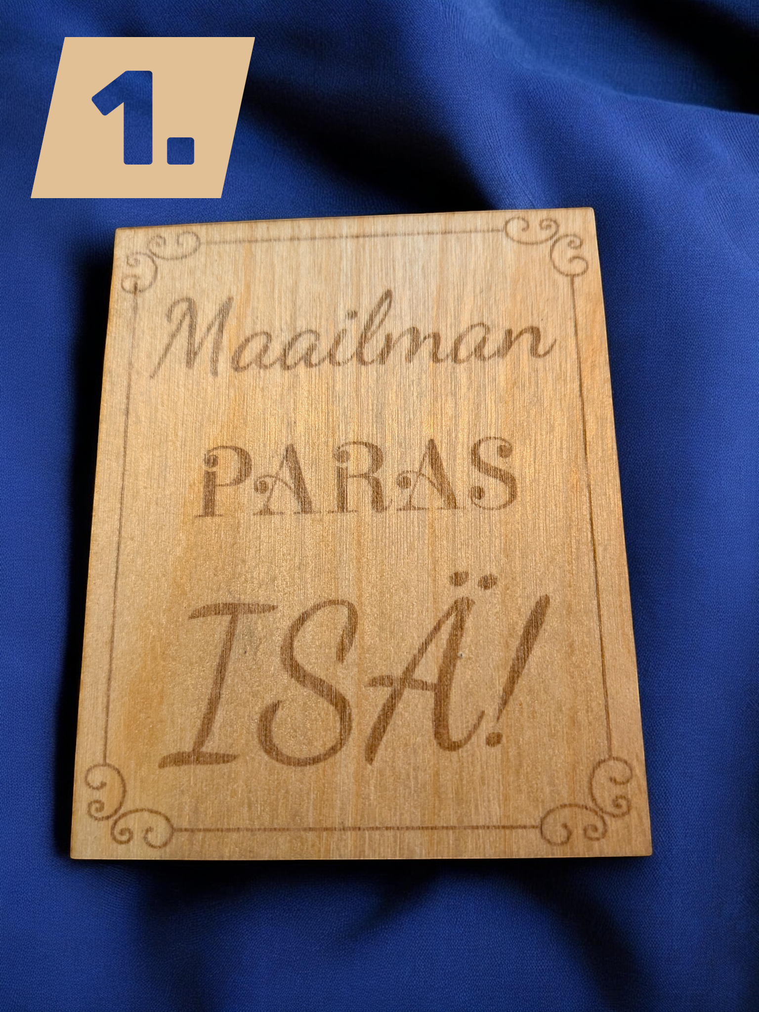 Each card is made of 3 mm birch plywood, engraved with precision and sealed with a protective varnish to ensure the engraving lasts. The card size may slightly vary (approx. 7.5–8 × 9.5–10.5 cm) as each piece is individually crafted. You can request your own text here too.