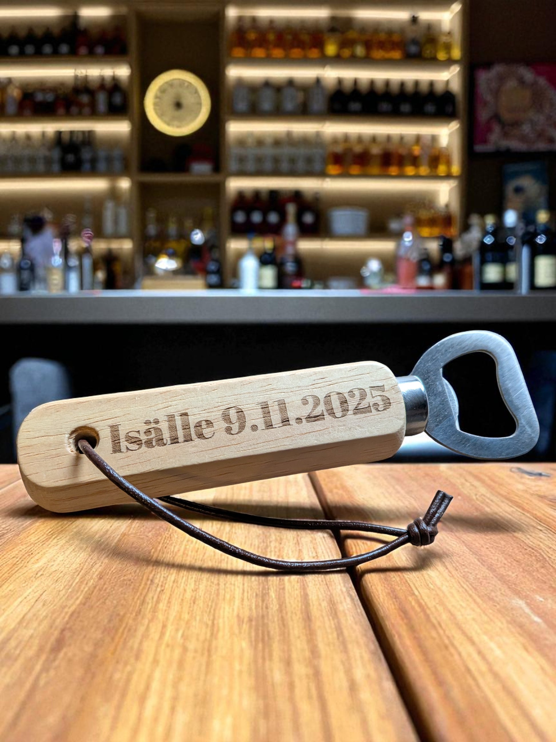 The opener features a pre-drilled hanging hole and comes with a genuine leather strap for a natural, premium finish.