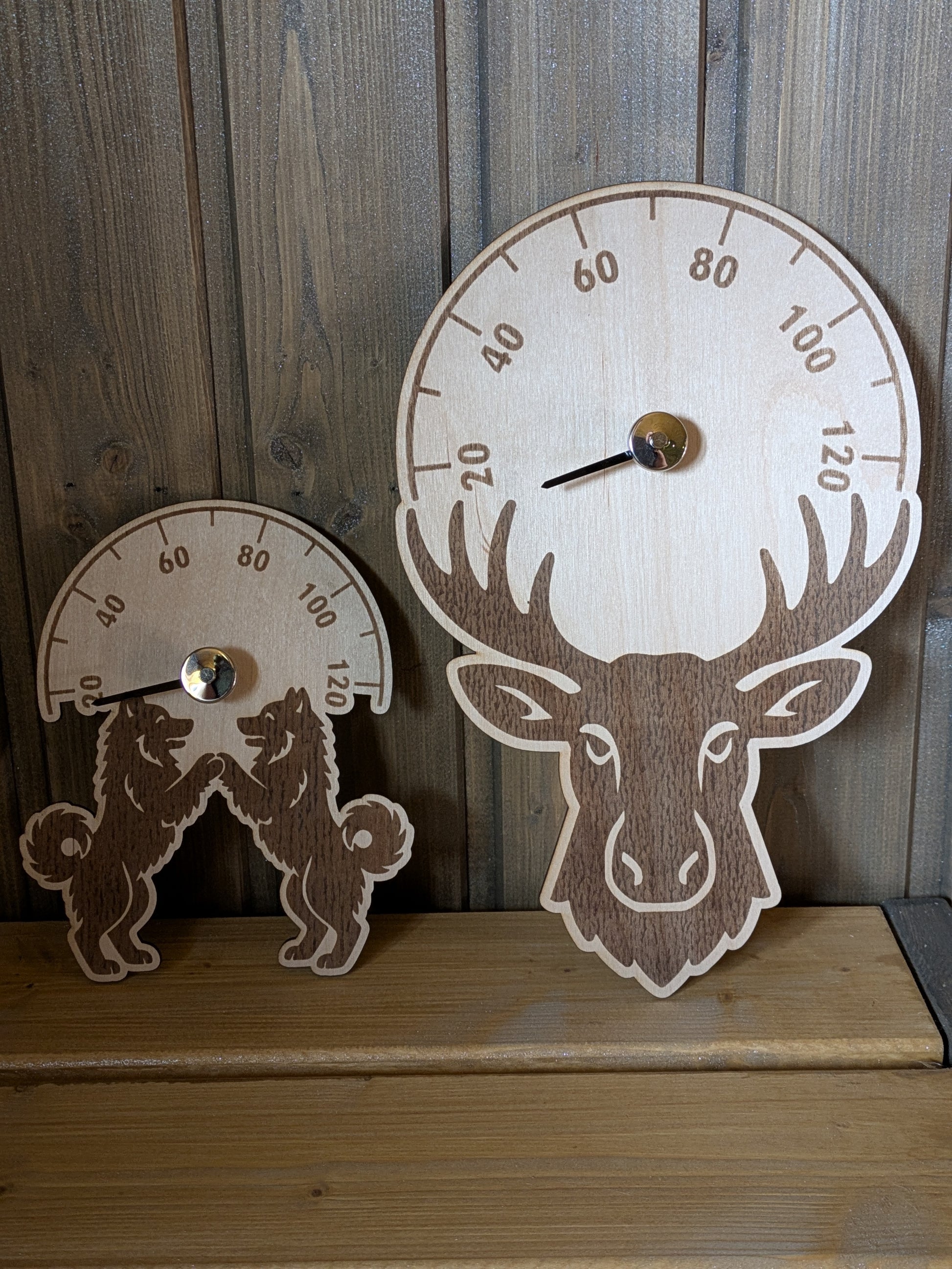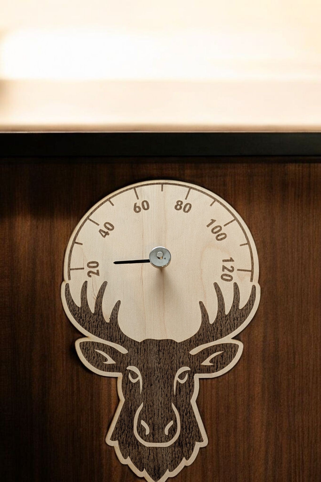 Tässä näyttävässä mittarissa hirven vahvat sarvet muodostavat lämpöasteikon kaaren. Koristeellinen ja käytännöllinen mittari tuo metsäistä tunnelmaa saunaan tai mökille – täydellinen lahja luonnonystävälle.