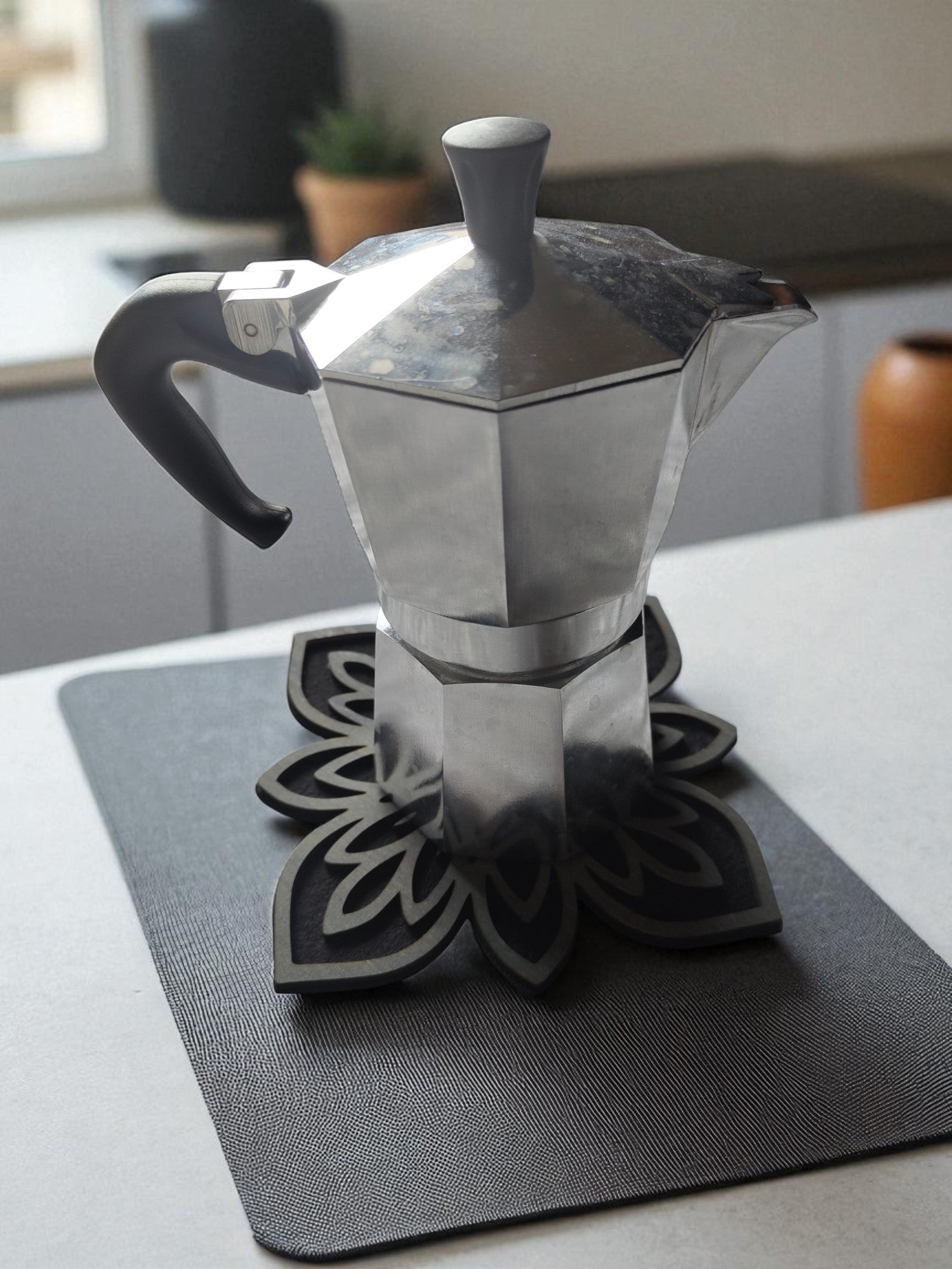 Precision laser-cut from 3 mm birch plywood, the piece is stained to bring out the natural grain and sealed with a protective lacquer for durability. The black felt base protects your table surface from heat, scratches, and slipping, making it both functional and decorative.