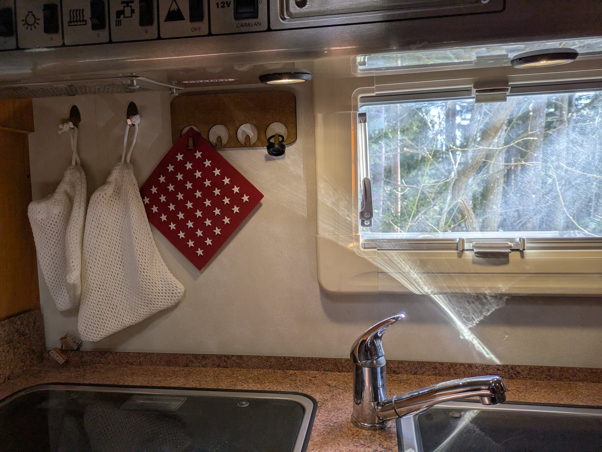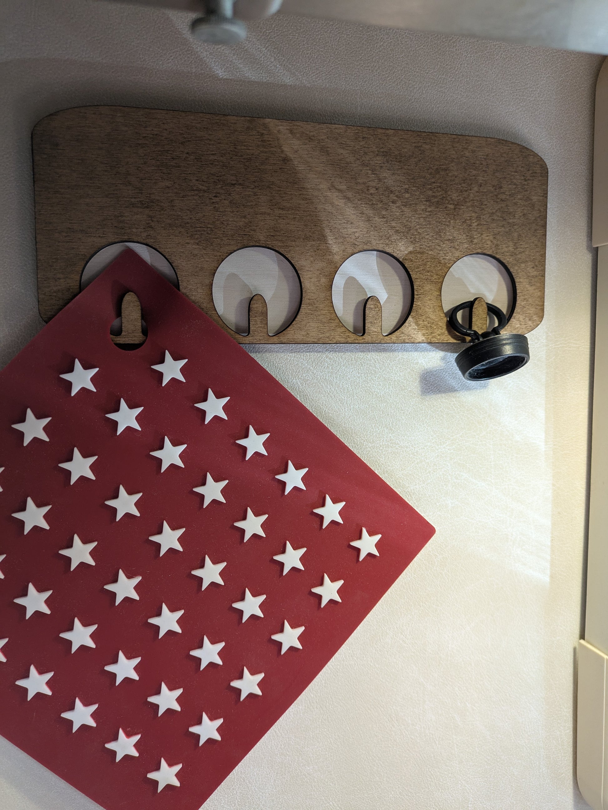 Tyylikäs ja matalarakenteinen naulakko asuntovaunun, matkailuauton tai muun pienen tilan sisustukseen. Valmistettu käsityönä 3mm mm paksuisesta koivuvanerista ja viimeistelty kauniisti kahdella eri sävyllä: