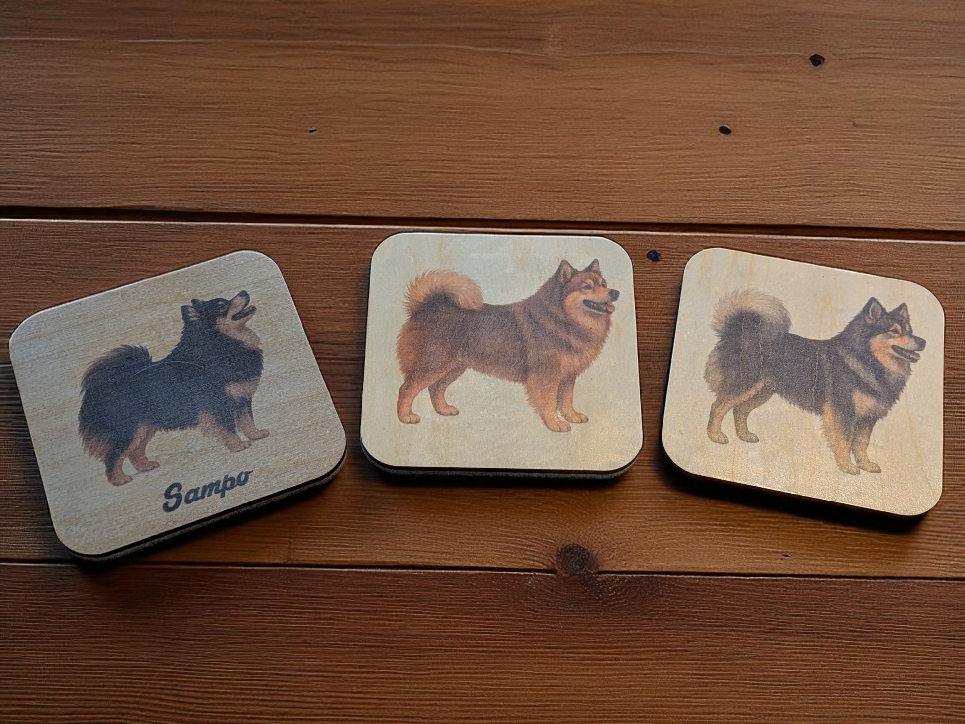 Käsin viimeistellyt ja lakatut puulasinaluset, joissa on yksityiskohtainen painokuva suomalaisesta rakkaasta kansalliskoirastamme – suomenlapinkoirasta. Valittavissa kolme värivaihtoehtoa, ja neljäs sävy tulossa pian – sekä yhteensopiva teline.