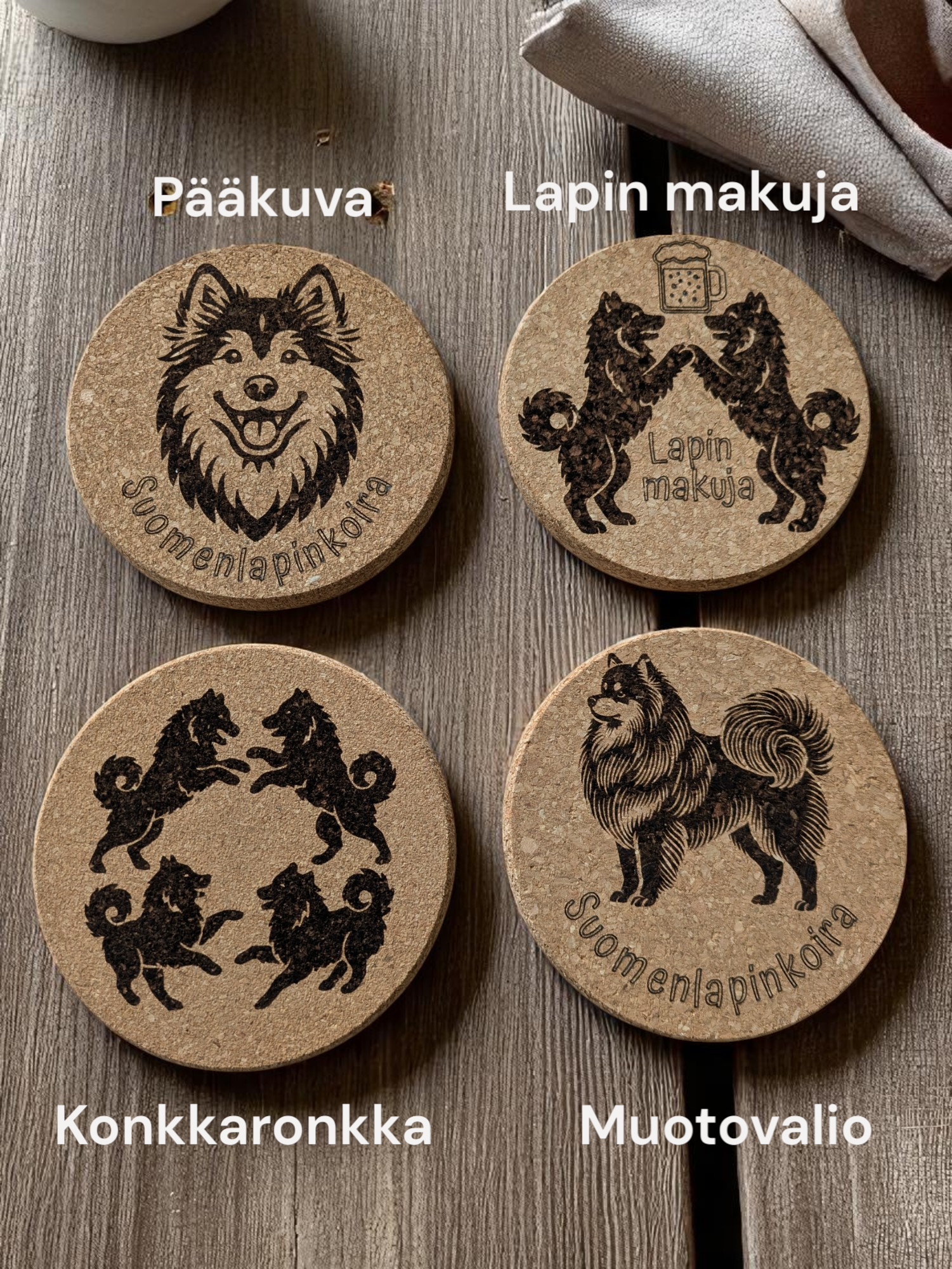 Tässä kauniissa lasinalussetissä yhdistyvät suomalainen koirarotu ja lämmin tunnelma. Aluset on valmistettu FSC-sertifioidusta luonnonkorkista ja niihin on laserkaiverrettu suomalaisista lapinkoirista inspiroituja kuvituksia. Setti sopii täydellisesti lahjaksi, mökille tai oman kodin iloksi.