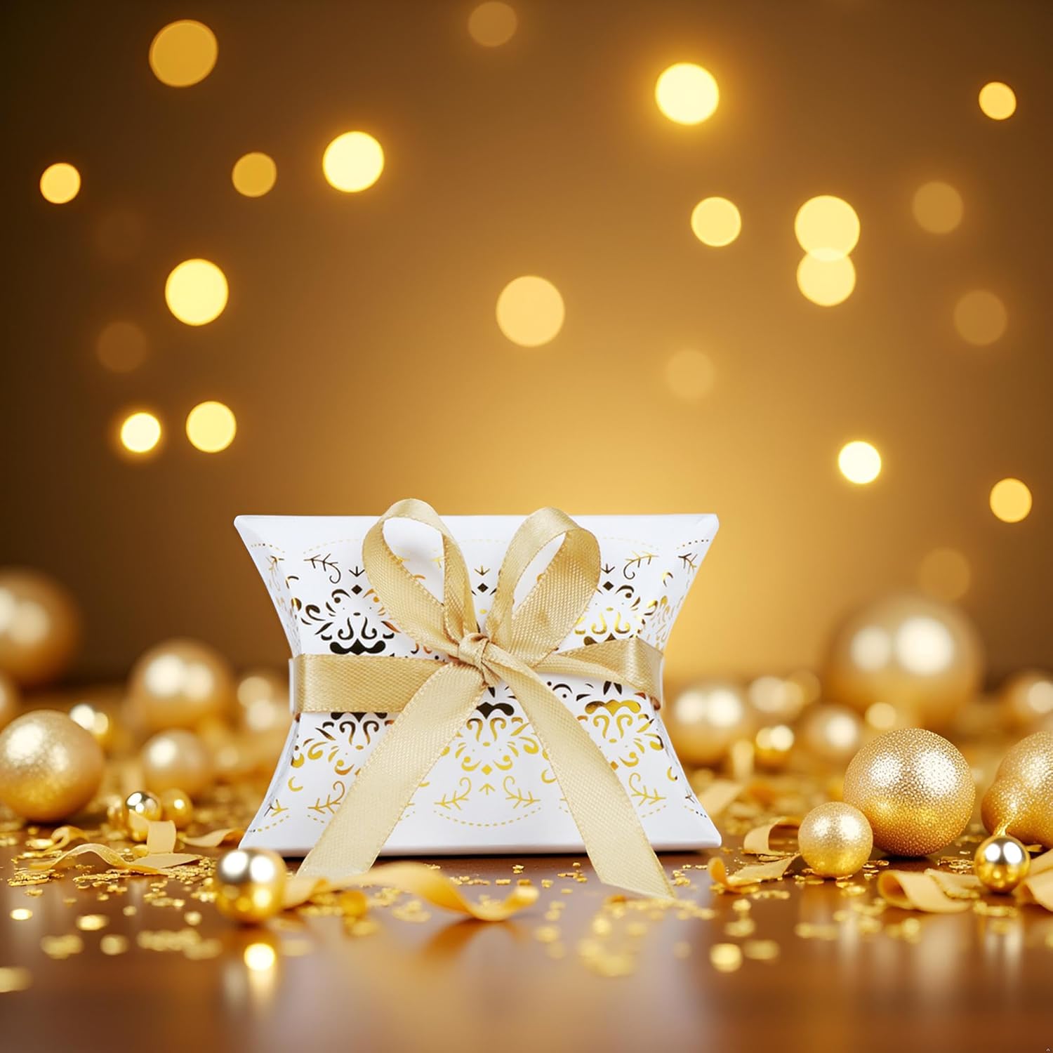Luxurious white and gold pillow box with a beautiful laser-cut design and satin ribbon. Perfect for packaging jewellery, small gifts, chocolates, or other small items. Delivered flat and easy to assemble. Ribbon included. A perfect match for pairing with earrings from our shop and other small jewellery.