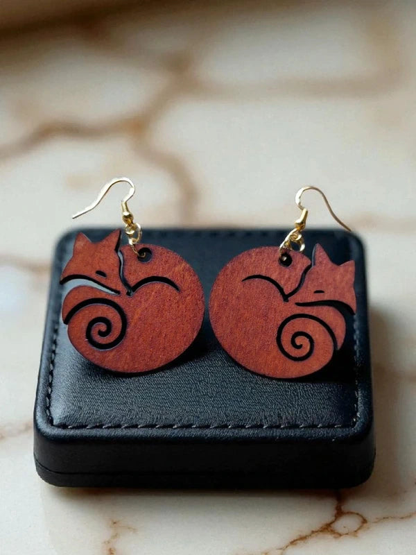 Beautiful wooden earrings featuring a charming curled fox design, laser cut with precision. The wood is stained in a warm, autumn-inspired tone and finely finished for lasting beauty.