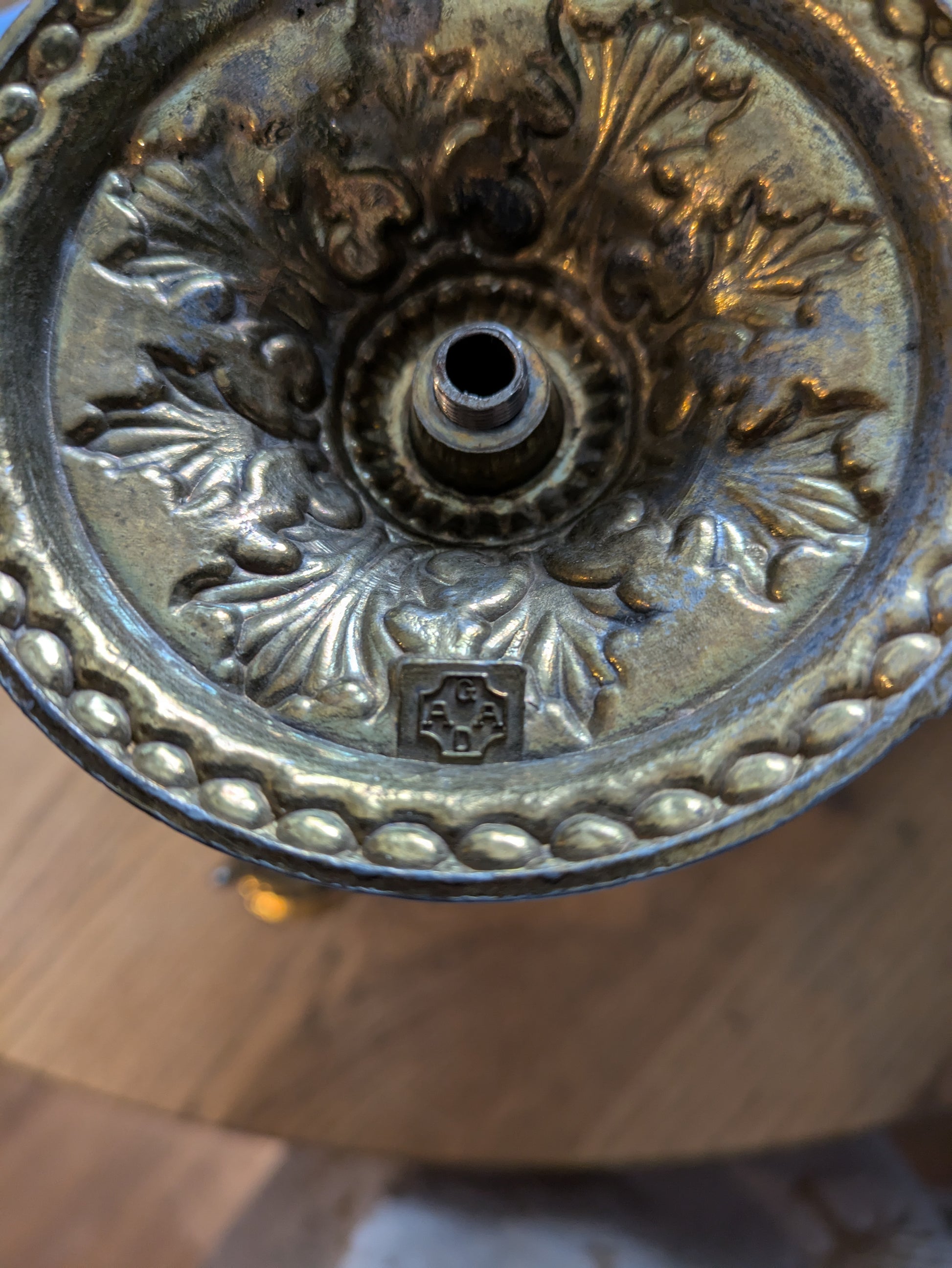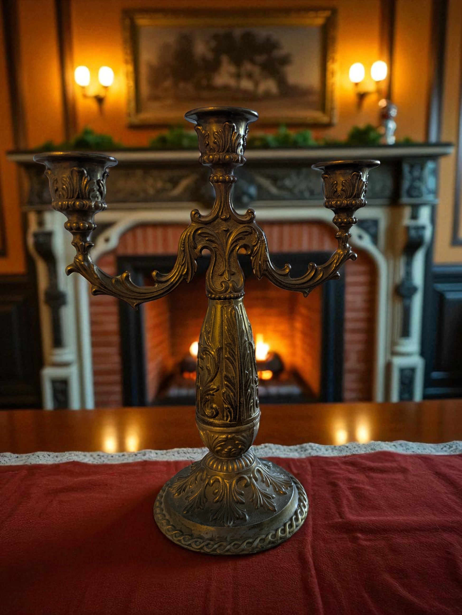 Tämä massiivinen kolmihaarainen kynttilänjalka on valmistettu Saksassa tunnetun GAAD-valimon (Gießerei August Adolf Daum) toimesta. Esine on kaunis esimerkki klassisesta eurooppalaisesta metallivalutyöstä, ja sen painava rakenne ja yksityiskohtainen ornamentiikka tekevät siitä katseenvangitsijan missä tahansa sisustuksessa.