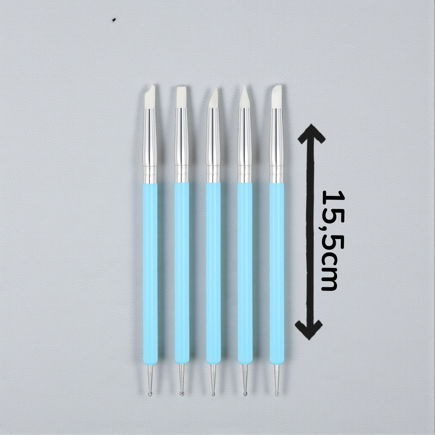 Setti sisältää 5 erilaista työkalua, joissa on vaihtelevat pallokärkien koot ja silikonipäiden muodot.