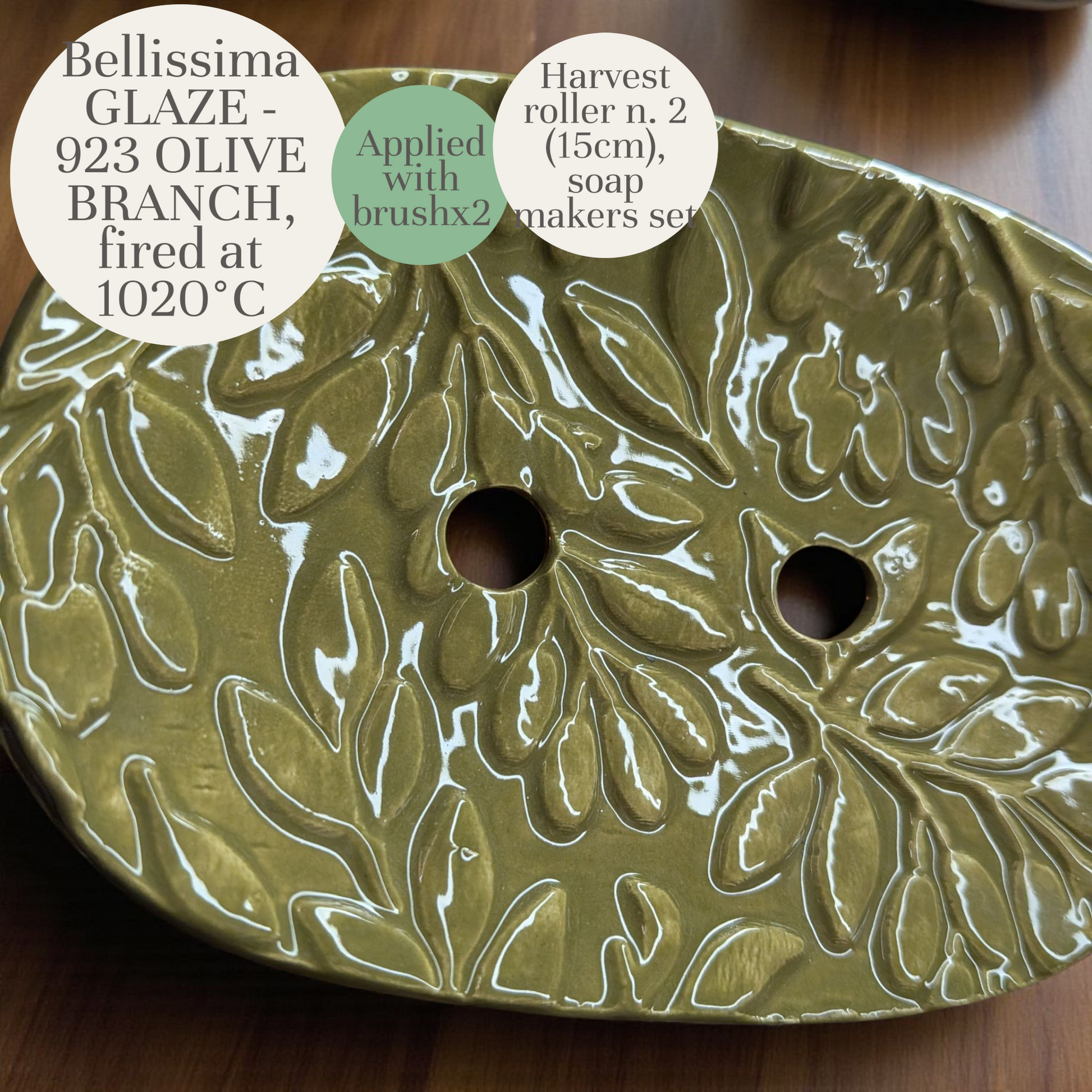 Bellissimo Olive branch on korkealaatuinen, kirkas ja helposti käytettävä lasite, joka sopii sekä aloittelijoille että kokeneille keramiikkataiteilijoille. Lasitetta voi levittää siveltimellä, sienellä, tiputuksin tai käsipainannalla, joten se soveltuu erinomaisesti työpajoihin, studioihin, keramiikkakahviloihin ja oppilaitoksiin.