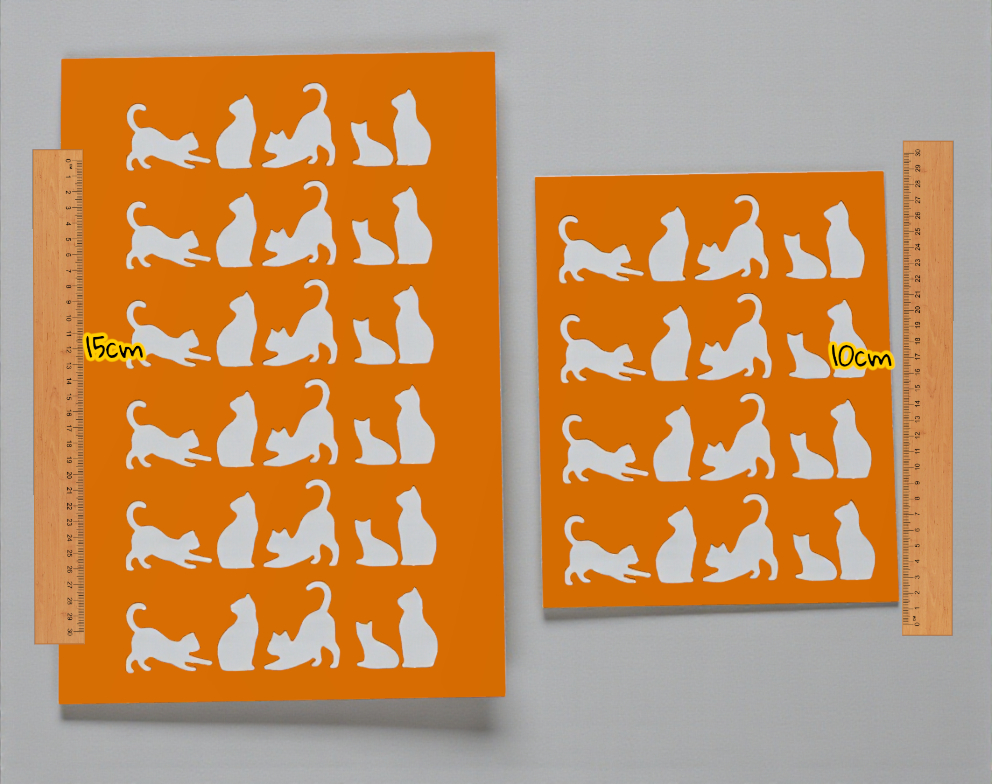 Nämä kissateemaiset sabluunat on suunniteltu tarkkaan kuviointiin saven, paperiaskartelun, sekatekniikan ja erilaisten koristepintojen kanssa. Muotoilu sisältää useita kissan siluetteja riveittäin, joten voit tehdä toistuvia kuvioita tai käyttää yksittäisiä muotoja kerrokselliseen koristeluun.