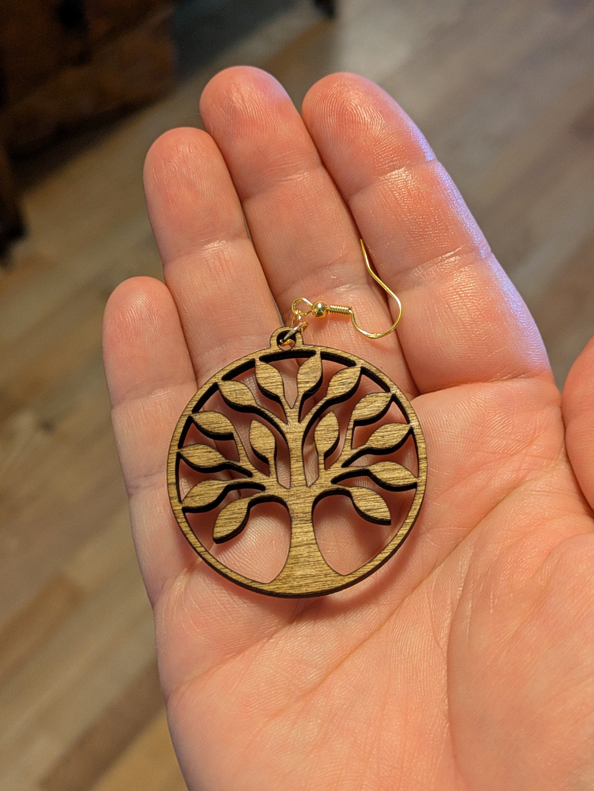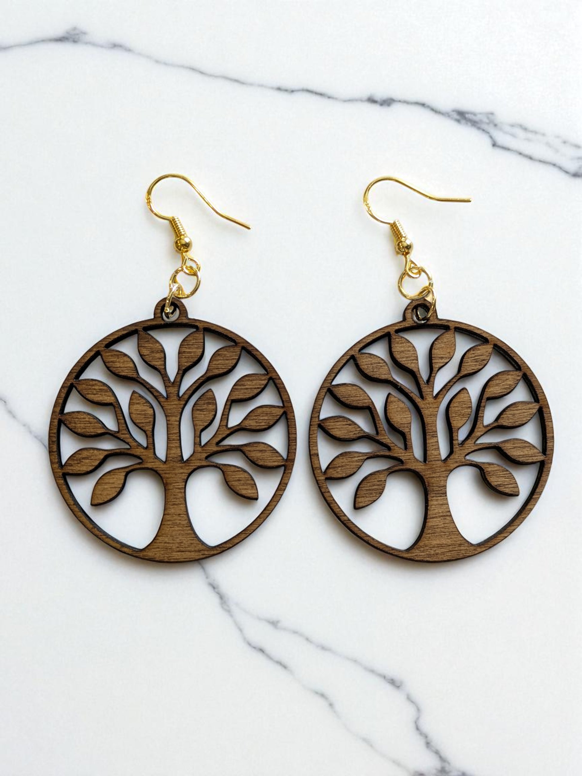 Nämä kauniit, laserleikatut Elämänpuu-korvakorut on valmistettu suomalaisesta koivuvanerista ja viimeistelty lämpimän sävyisellä petsillä.