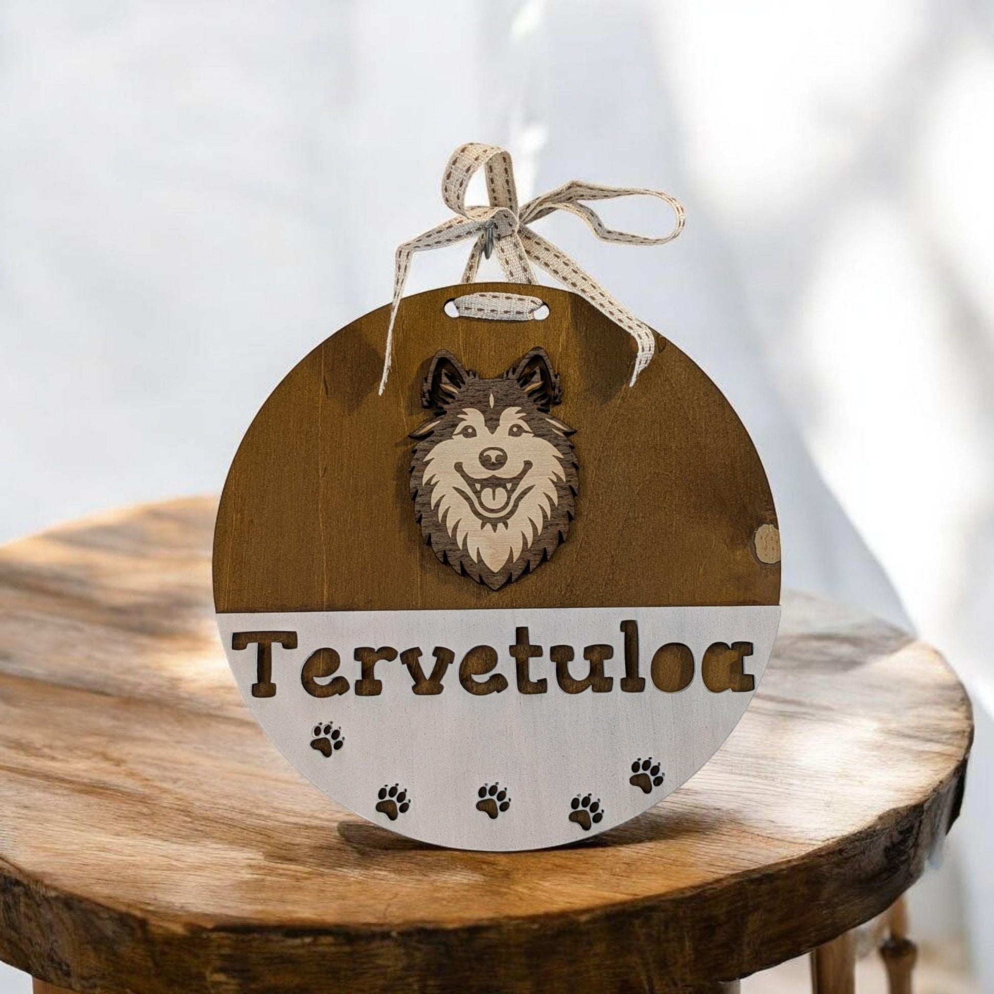Toivota vieraat tervetulleiksi tällä kauniisti käsintehdyllä ovikyltillä! Yksityiskohtainen laserleikattu suomenlapinkoirakuvio, tassunjäljet ja kaiverrettu "Tervetuloa"-teksti tekevät tästä kyltistä täydellisen lisän koiranystävien ja pohjoismaisen sisustuksen rakastajien kotiin.