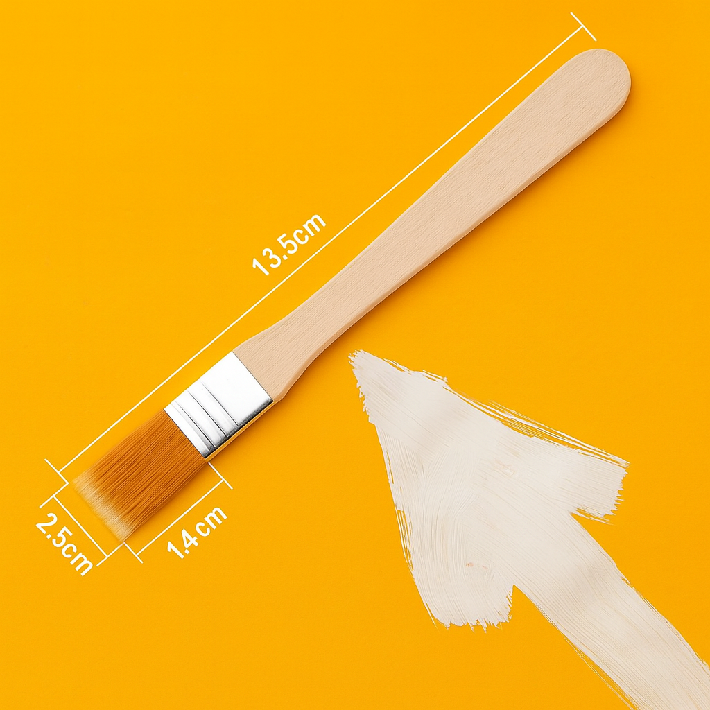 Tämä litteä nylon-sivellin puuvarrella on käytännöllinen valinta moniin projekteihin. Siveltimen pituus on 13,5 cm ja harjaksen leveys noin 1,4 cm. Kestävät nailonharjakset pysyvät hyvin paikoillaan ja on helppo puhdistaa käytön jälkeen. Puinen kahva istuu mukavasti käteen, ja alumiininen kiinnitys tekee siveltimestä tukevan ja pitkäikäisen.