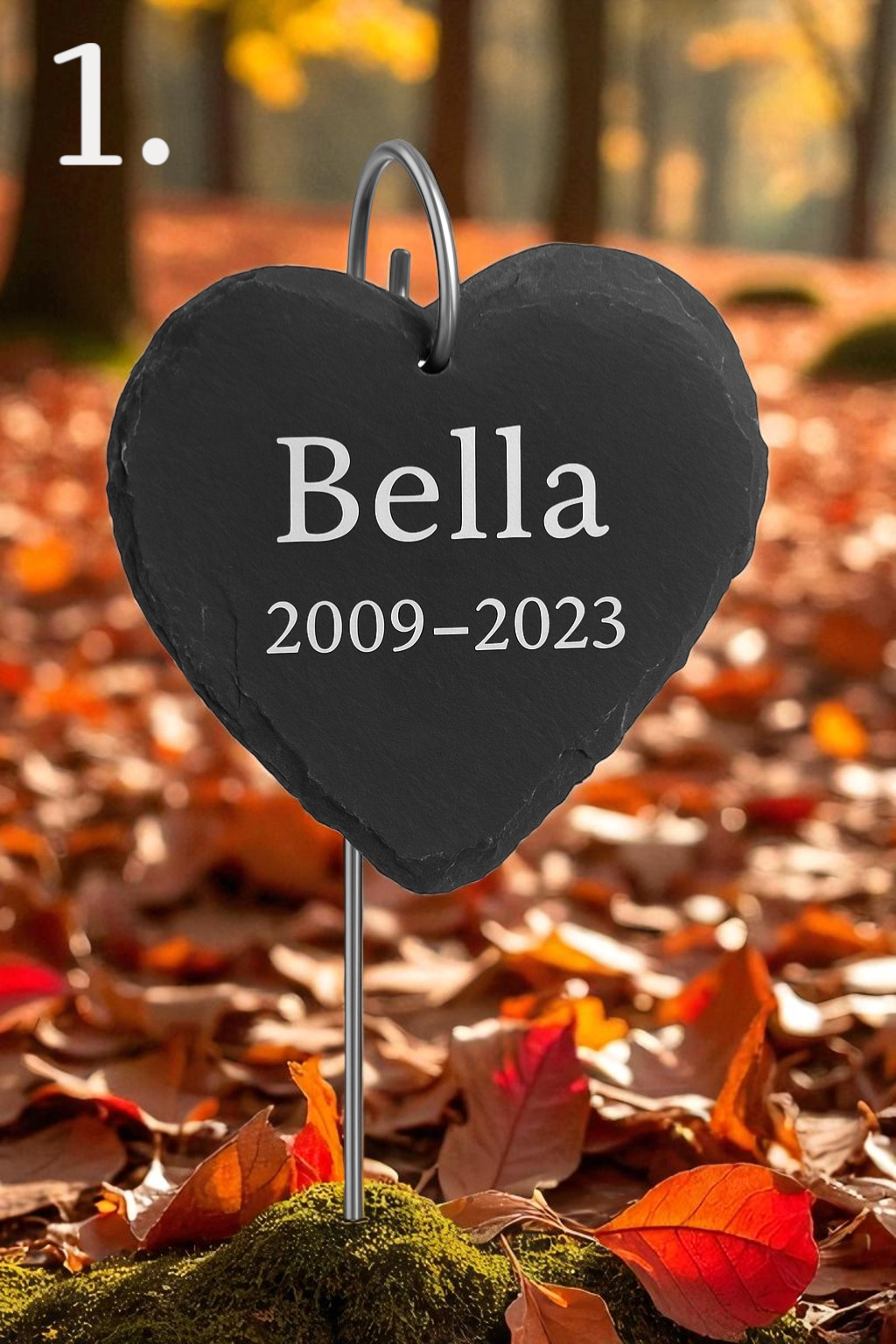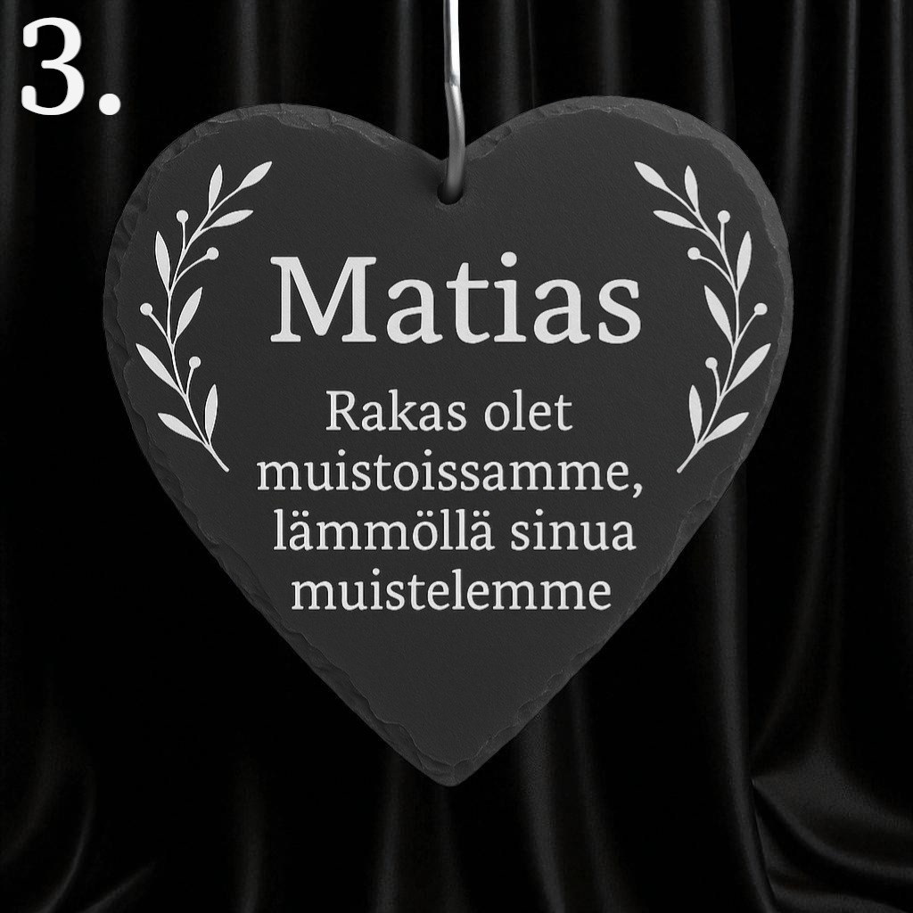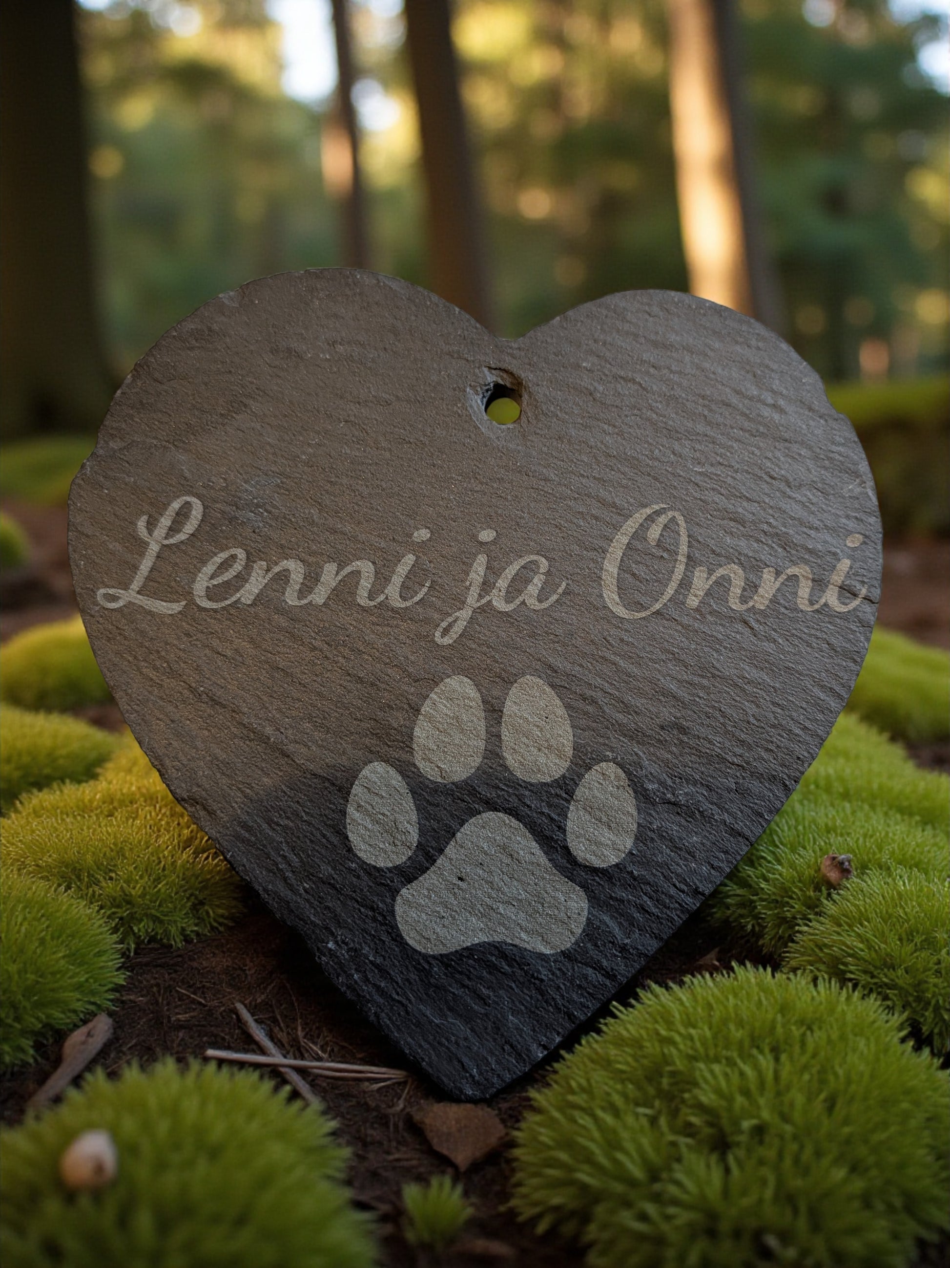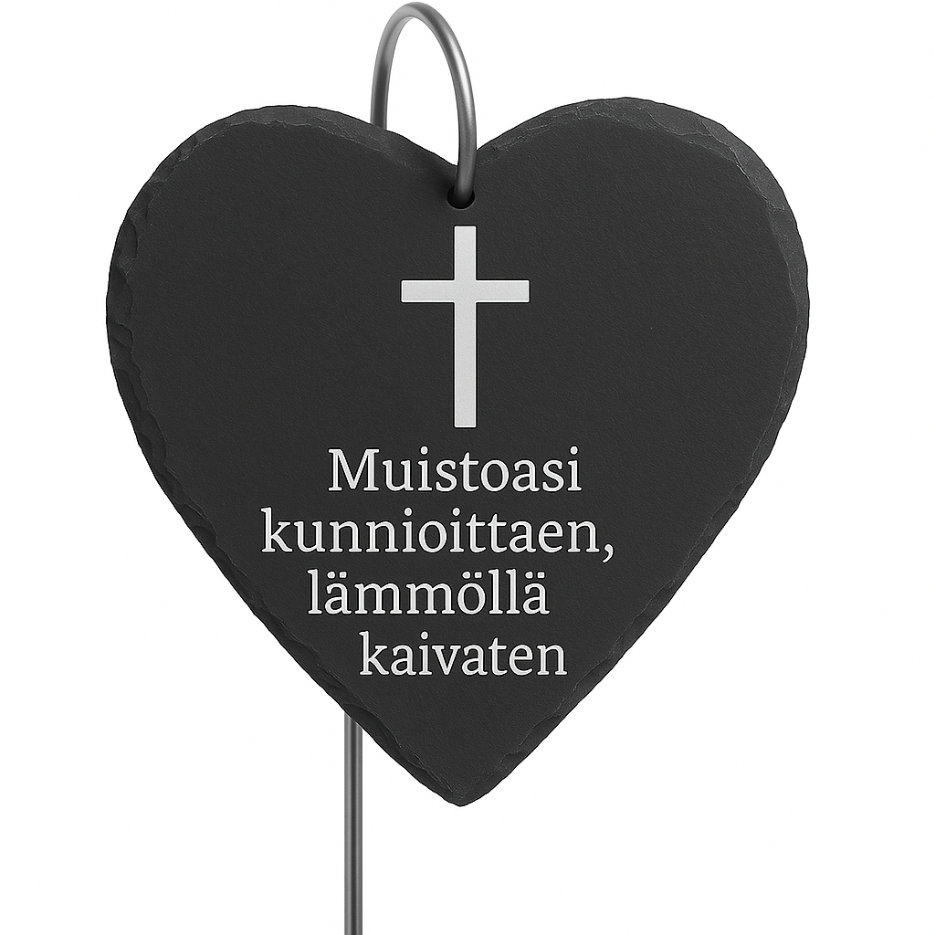 Tämä kauniisti viimeistelty liuskekivinen muistokyltti on arvokas tapa muistaa rakas ihminen tai lemmikki. Kyltissä yhdistyvät luonnollinen kivipinta ja ruostumaton teräs – se kestää aikaa ja säätä, sopien niin puutarhaan kuin muistohyllylle sisätiloihin.