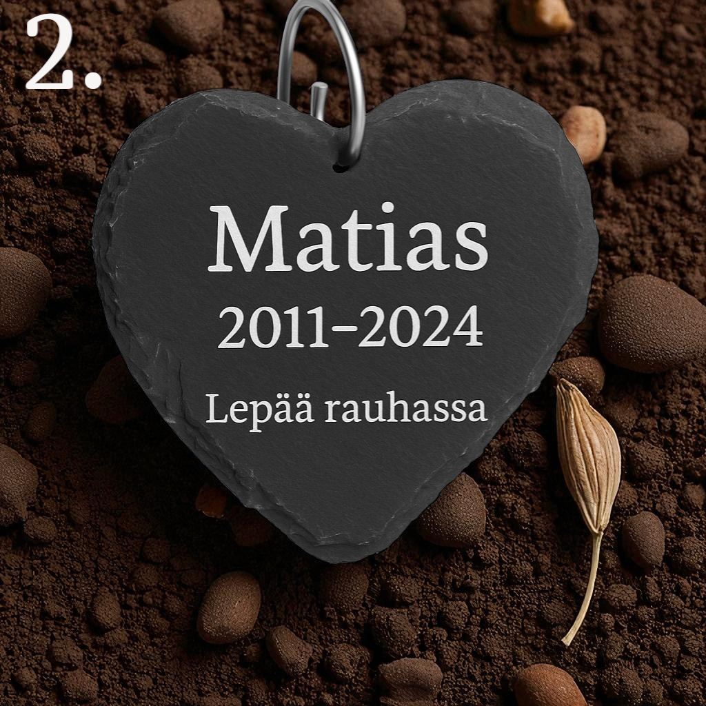 Tyyli 1 on yksinkertaisin vaihtoehto. Sisältää vain nimen ja syntymä-/kuolinvuodet. Päivämäärät tai pienet kuviot (sydän, tassu, siivet, kissa siivillä, koira siivillä, risti) voidaan lisätä pyynnöstä.