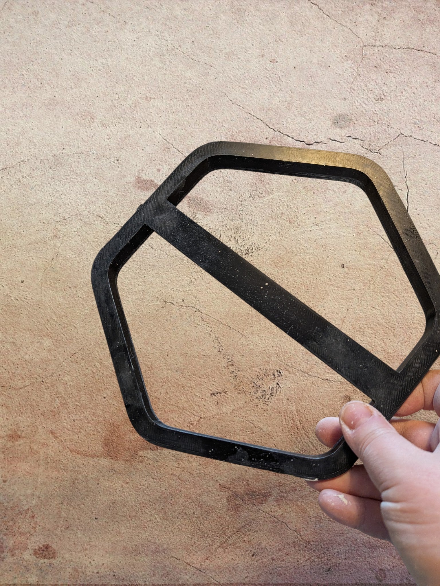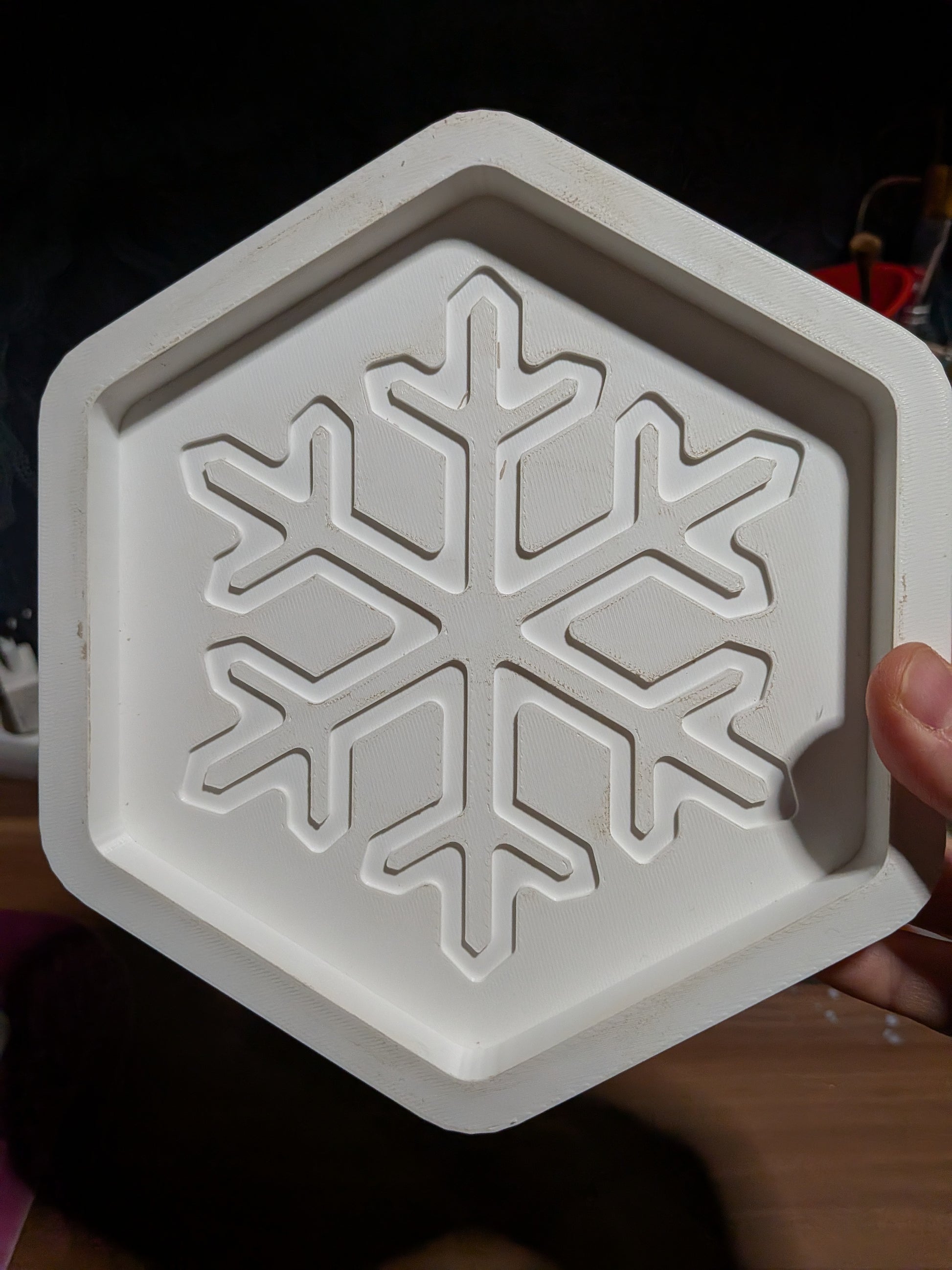 Tämä kuusikulmainen savimuotti sisältää selkeälinjaisen lumihiutalekuvion, joka on suunniteltu koristeelliseen keramiikkatyöskentelyyn. Muotin avulla kuvio siirretään saveen ja työ voidaan viimeistellä suoraan muotissa.