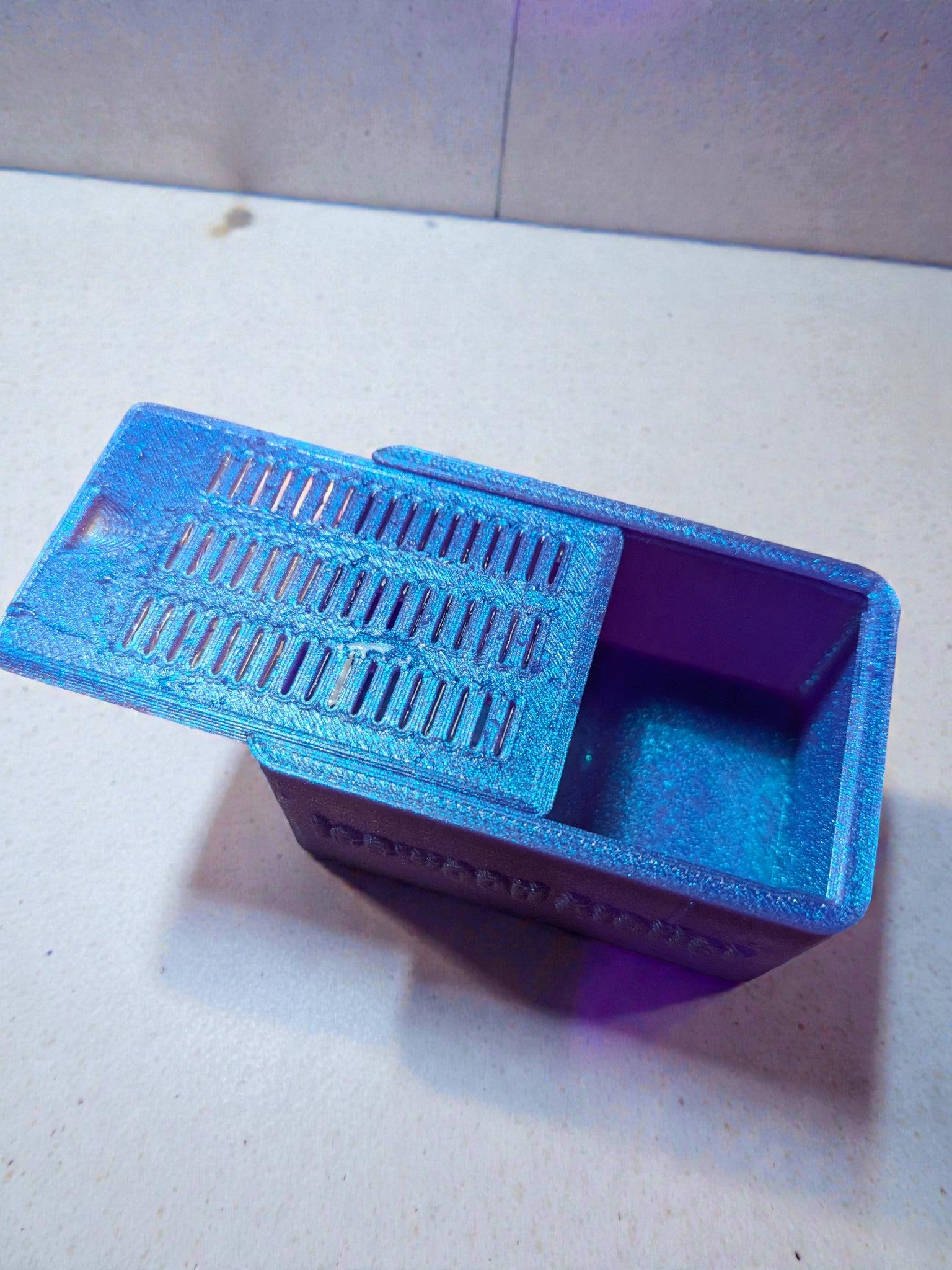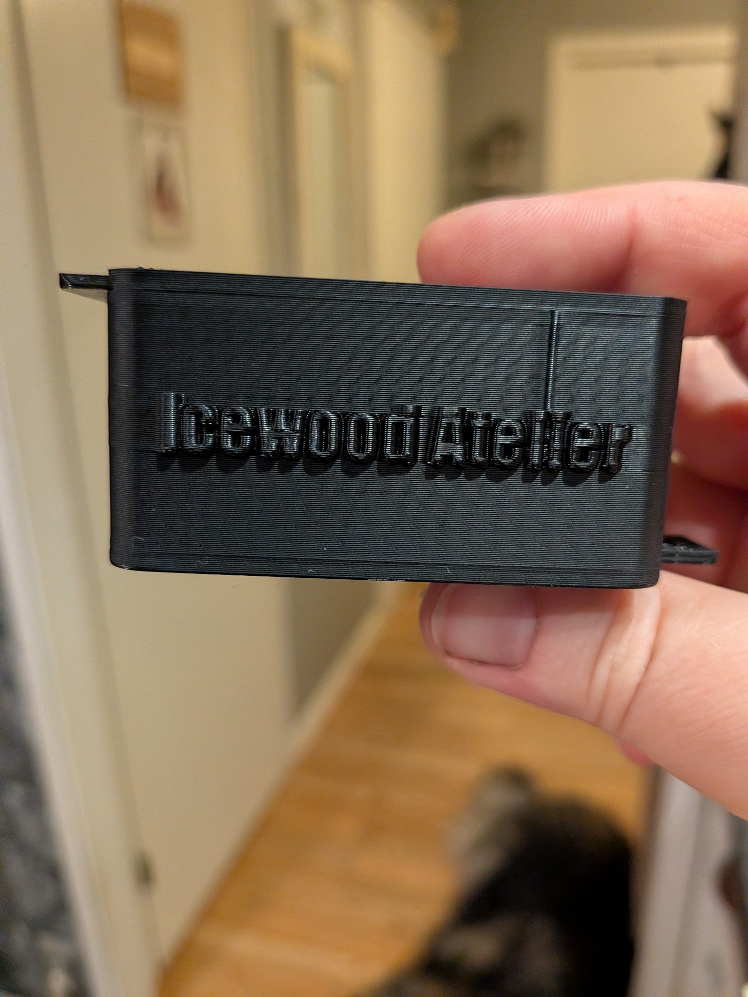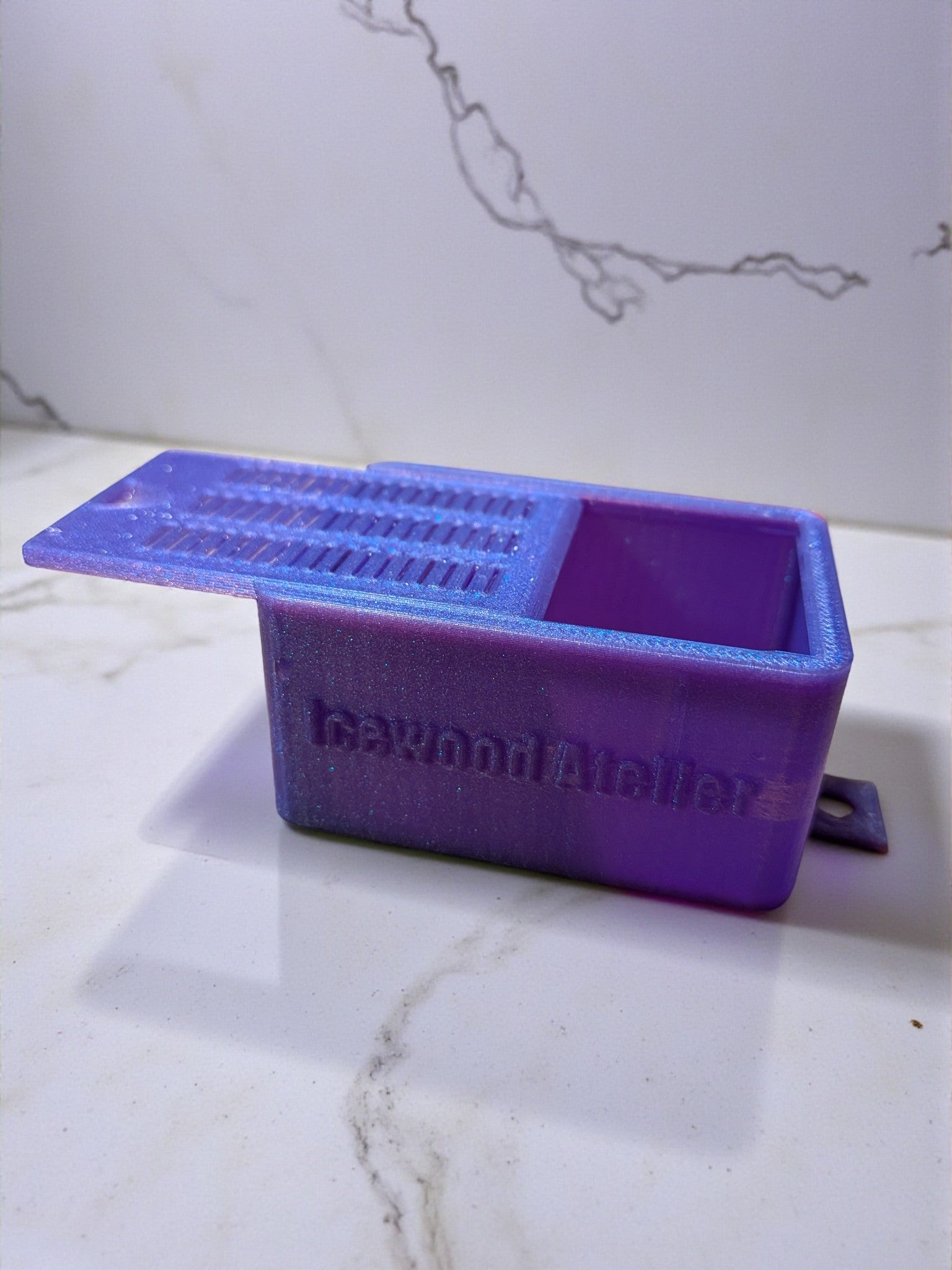 Laatikossa on tukeva slide-kansi, joka pysyy paikoillaan käytön aikana, sekä ripustusreikä helppoa säilytystä varten. Kylkeen on lisätty kohotekstinä “Icewood Atelier”.