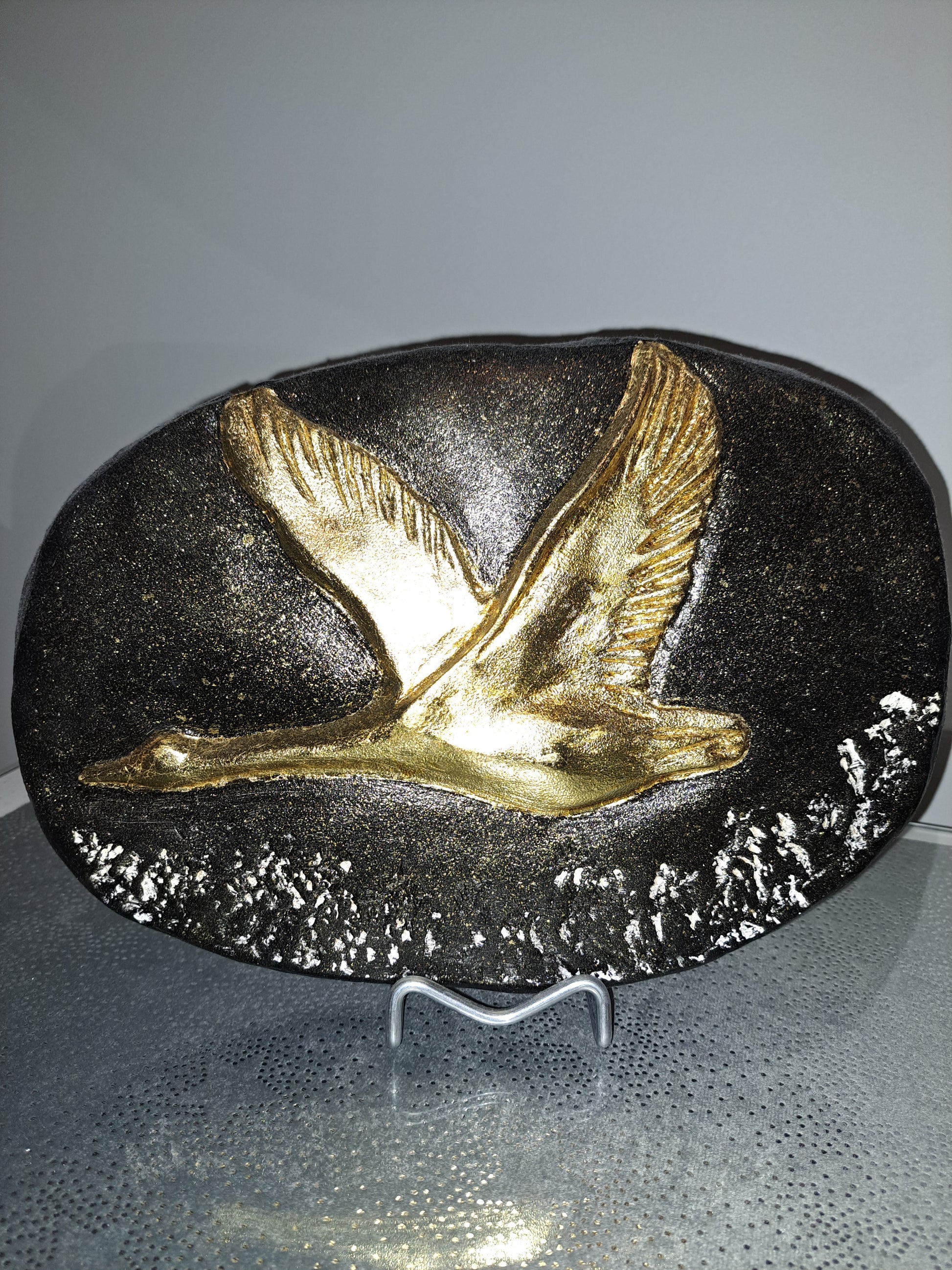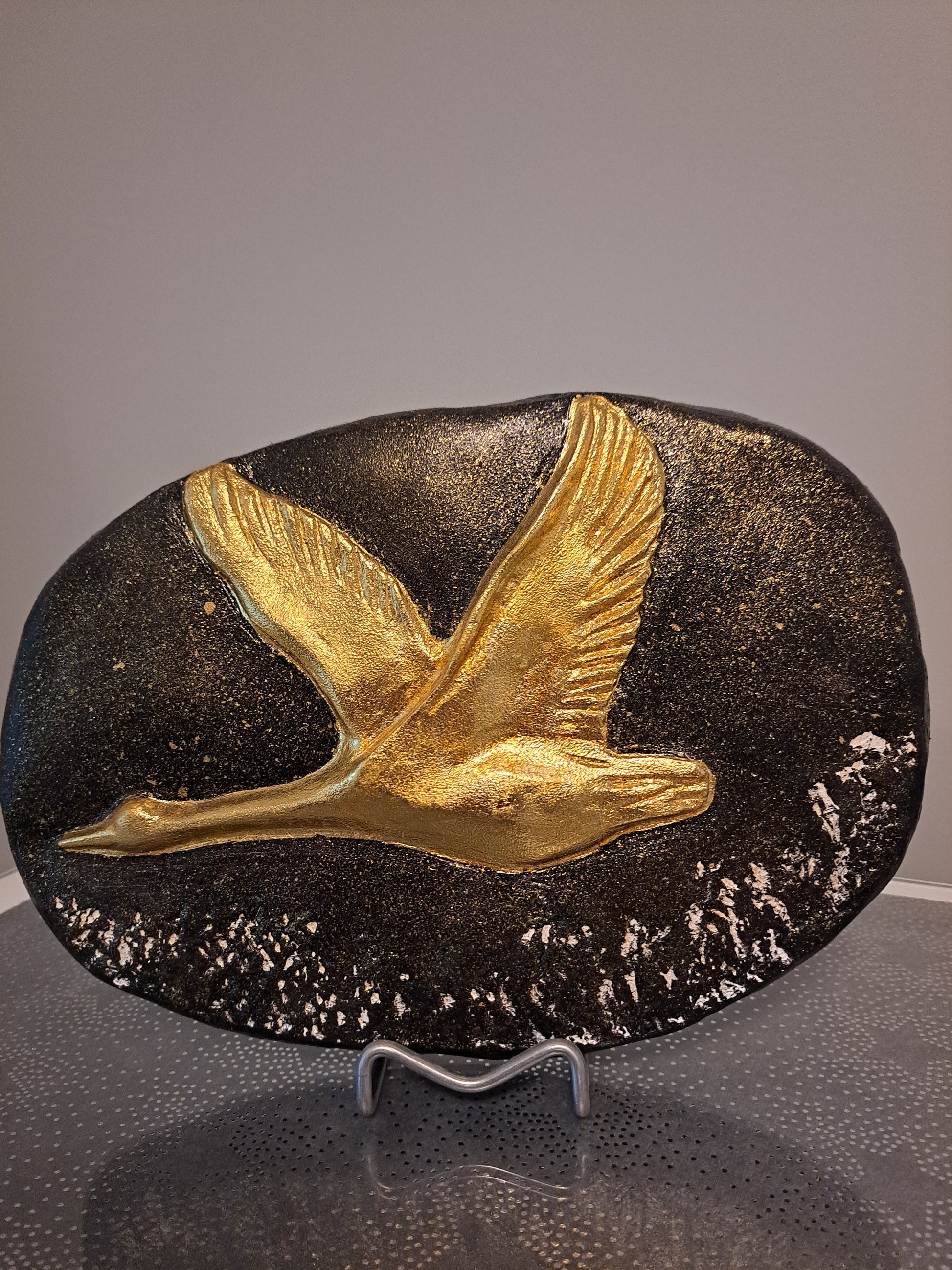Painava musta/"lehtikulta" joutsentaulu kipsiä, lev.n.30cm. kork.n.21cm. syv.n.2-3cm. Käsin maalattu akryylimaalilla ja kultaosuus pinnoitettu Vernissalla, muut alueet Colorfixillä. Mh.160,00€+ pakkaus ja postit 10,00€, ei sis. pöytätelinettä. HUOM! MMM.
