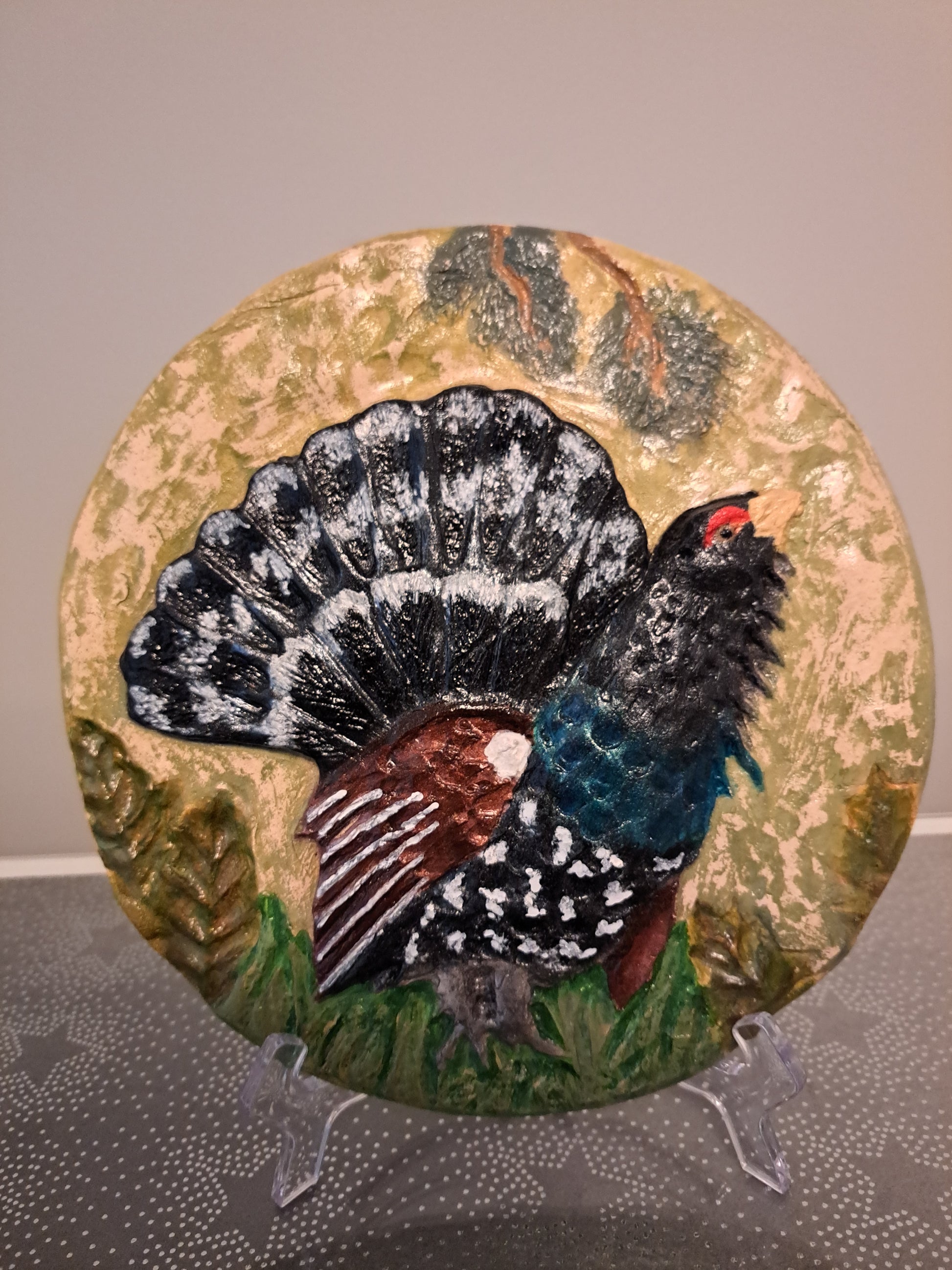 Uniikkimalli, painava keraaminen metsotaulu esim. metsästäjälle, koko= perus ruokalautanen eli n.22-23cm.halkaisija. Akryylimaalilla käsin maalattu ja Colofixillä pinnoitettu. Mh. 250,00€ sis.pöytätelineen (ei ripustusmahdollisuutta valmiina)+ pakkaus ja postit 10,00€. HUOM! MMM.