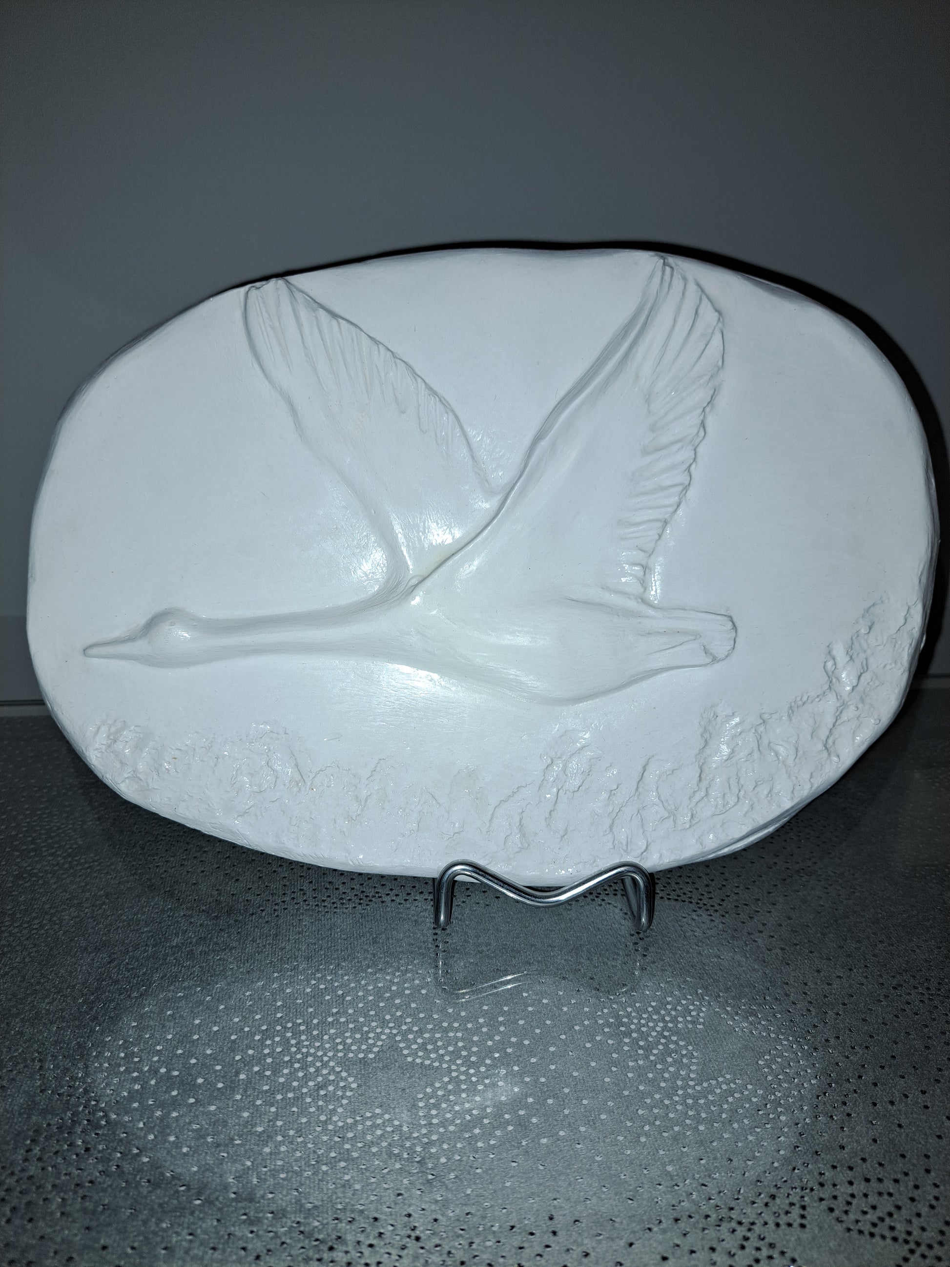 Joutsen uniikkimallit: Väri valkoinen, painava keraaminen tai kipsinen joutsentaulu seinälle tai pöytätelineeseen lev.n. 31cm kork.n. 21cm. ja syvyys n.2-3cm. Maalattu käsin akryylimalilla ja pinnoitettu Colorfixillä