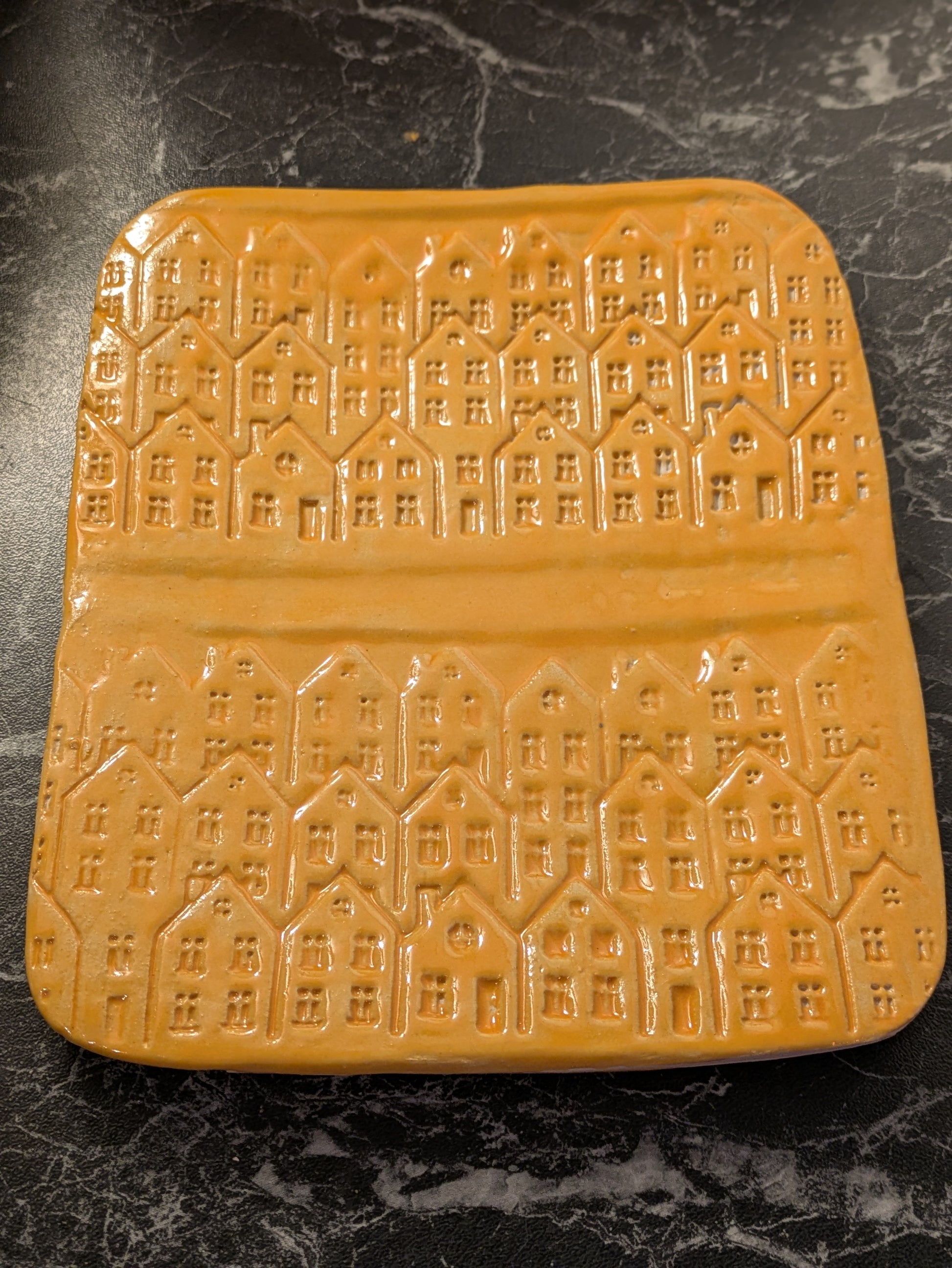 Tämä ainutlaatuinen lautanen on käsin valmistettu ja kuvioitu pienillä riveihin asettuvilla taloilla, jotka tuovat mieleen tiiviin ja tunnelmallisen kaupunkimaiseman. Lautanen on lasitettu lämpimän keltaisella lasitteella, joka korostaa yksityiskohtia ja tekee pinnasta kiiltävän ja elävän. Sopii kauniisti tarjoiluun, sisustukseen tai lahjaksi keramiikan ystävälle.
