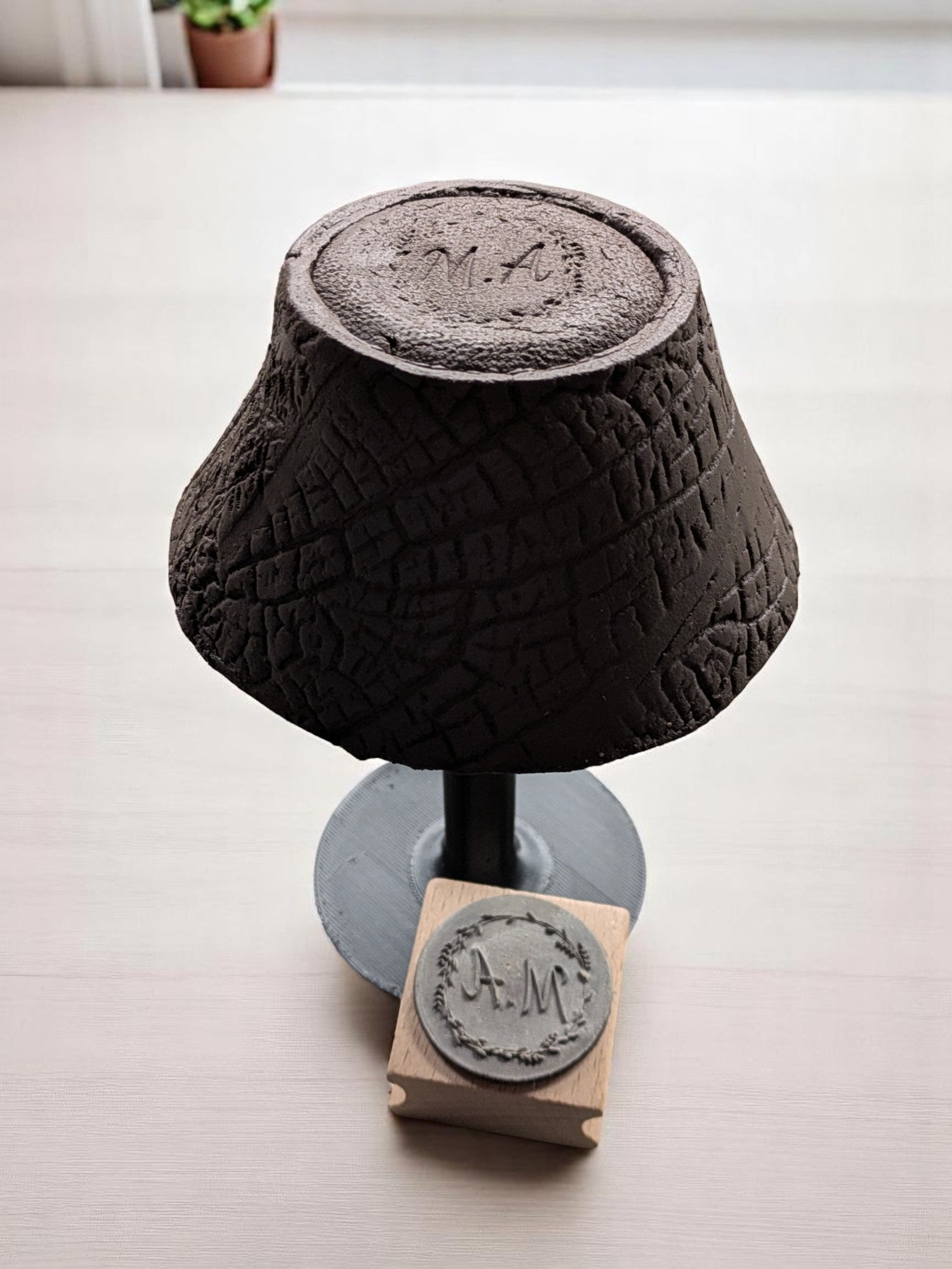 Tämä käytännöllinen leimausteline on suunniteltu helpottamaan keramiikkatöiden, erityisesti astioiden ja koriste-esineiden, pohjan leimaamista. Teline mahdollistaa työn pitämisen vakaana ja koholla, jolloin leiman voi painaa tarkasti paikoilleen ilman että savityö painuu kasaan tai vääristyy.