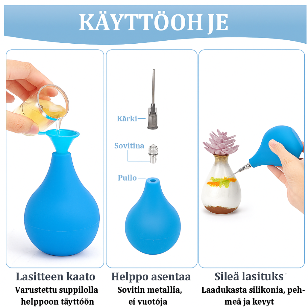 - 5 erikokoista ja -muotoista silikonista lasituspulloa