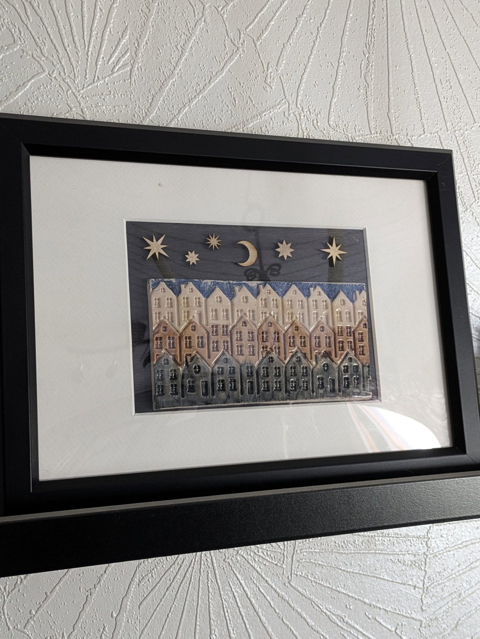 Tunnelmallinen käsintehty taideteos, jossa pieni kaupunki herää eloon yössä. Upea yksityiskohtainen keraaminen maisema on kiinnitetty uudelleenkäytetylle taulunkehykselle ja liimattu mustaksi petsattuun vaneriin. Taivasta koristavat kuunsirppi ja tähdet, jotka on leikattu puusta ja kiinnitetty kolmiulotteisesti. Kehyksen kirkas osa on muovia.
