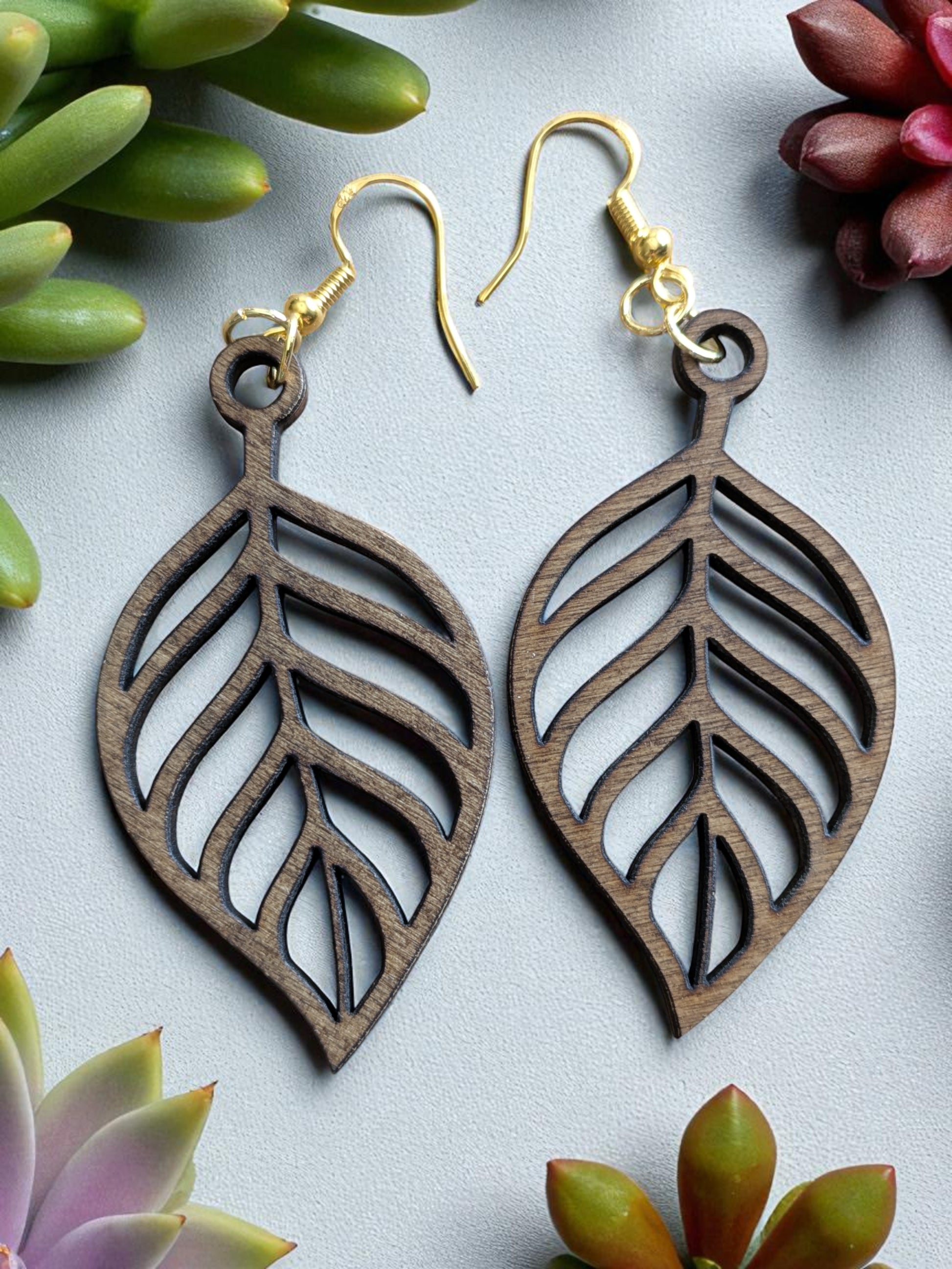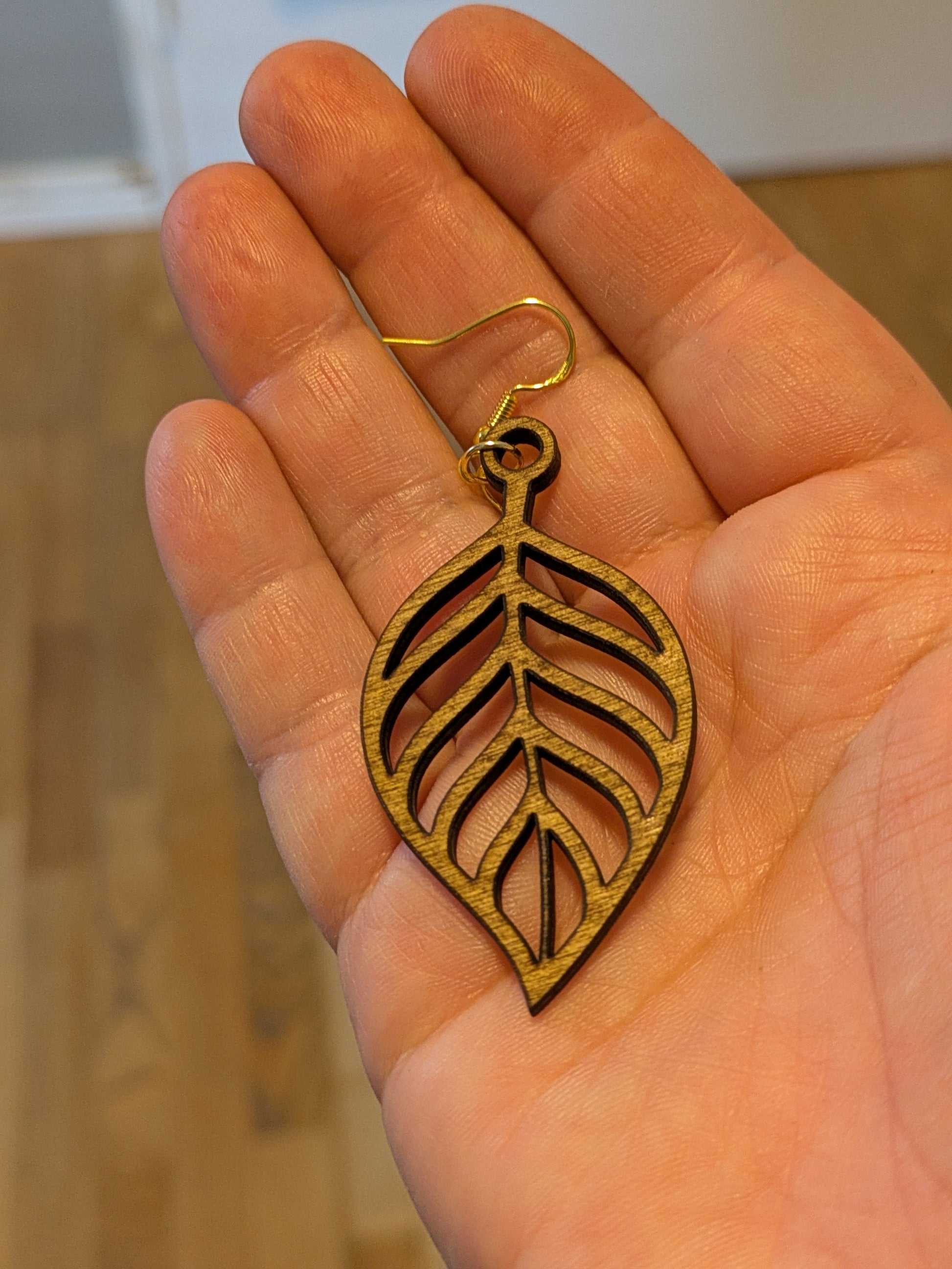Nämä kevyet ja näyttävät lehtikorvakorut on valmistettu laserleikatusta suomalaisesta koivuvanerista ja viimeistelty kauniin lämpimällä petsillä joka on kevyesti lakattu. Lehtimäinen muoto on ilmava mutta tukeva, ja selkeälinjainen siluetti tekee koruista ajattoman tyylikkäät.