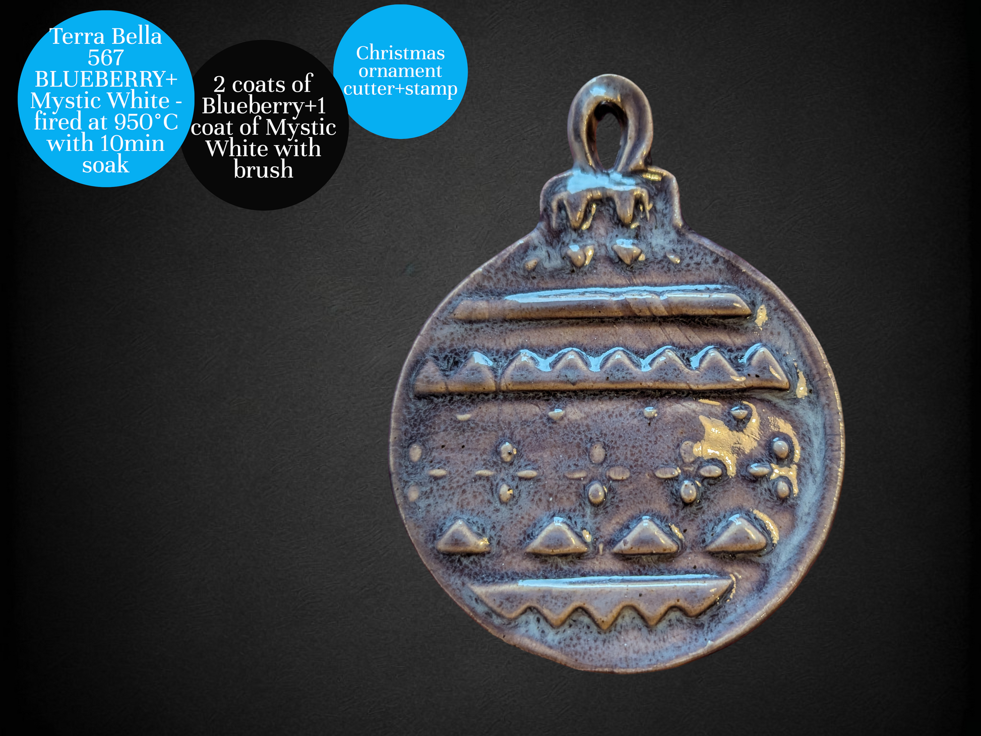Levitetty kaksi kerrosta Blueberry-lasitetta ja yksi kerros Mystic White-lasitetta siveltimellä.