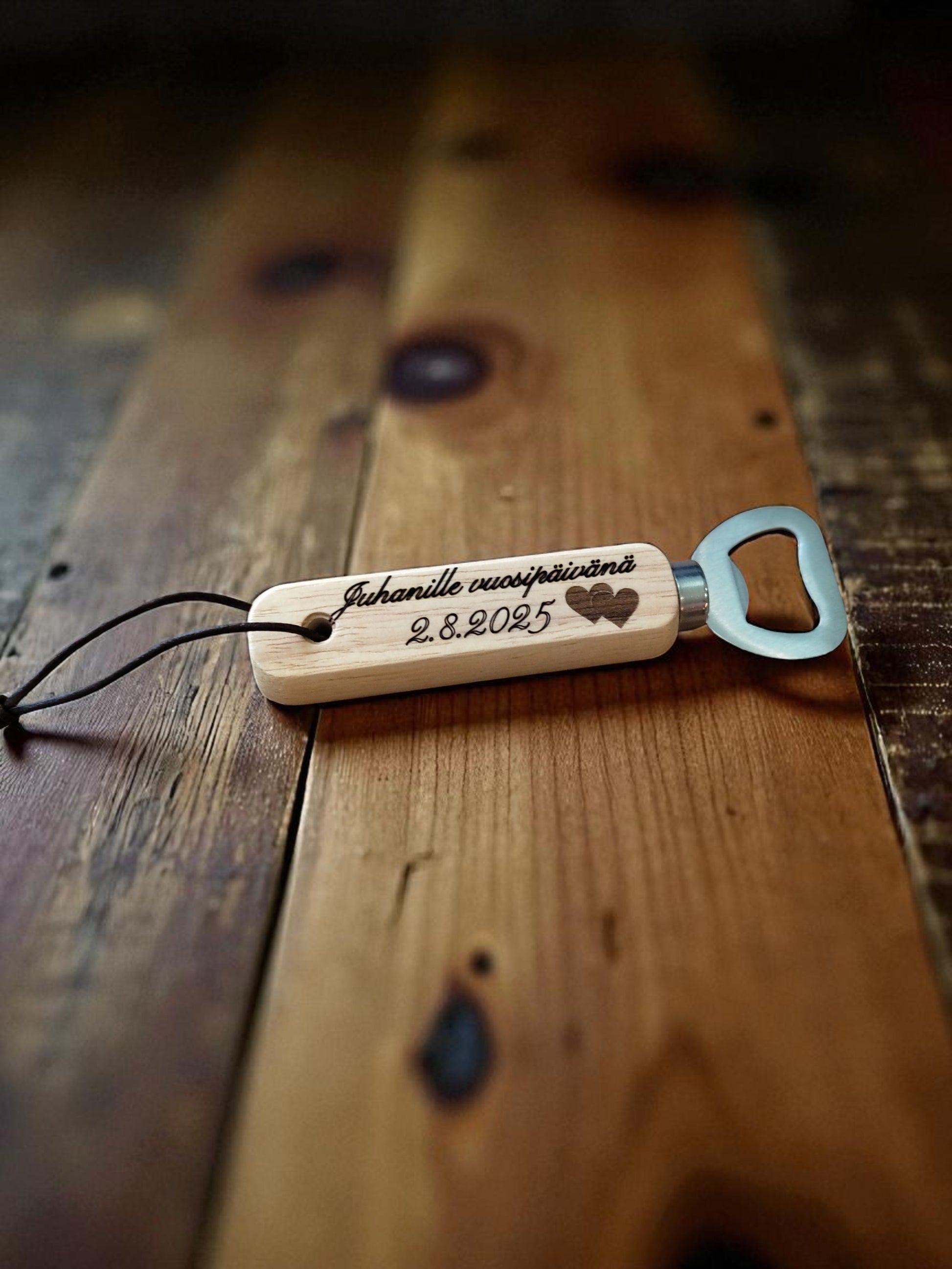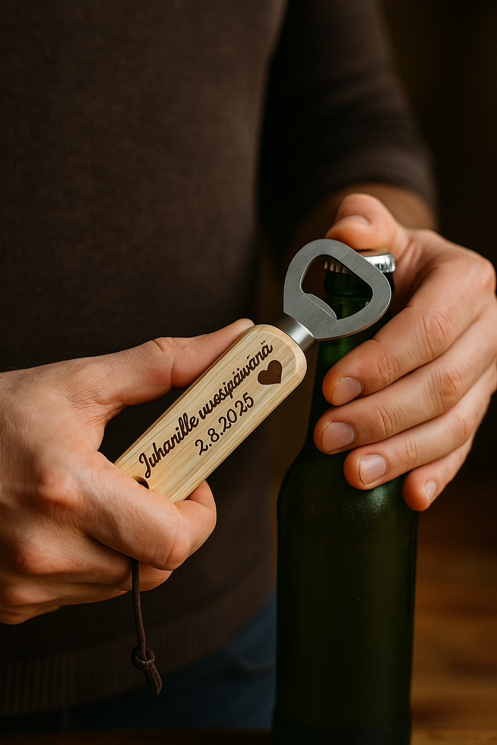 Tämä laadukas puinen pullonavaaja on kaunis ja käytännöllinen lahja moneen tilanteeseen. Luonnollinen, sileäpintainen kahva on miellyttävä kädessä ja soveltuu täydellisesti laserkaiverrukseen – lisää nimi, päivämäärä tai oma viesti.