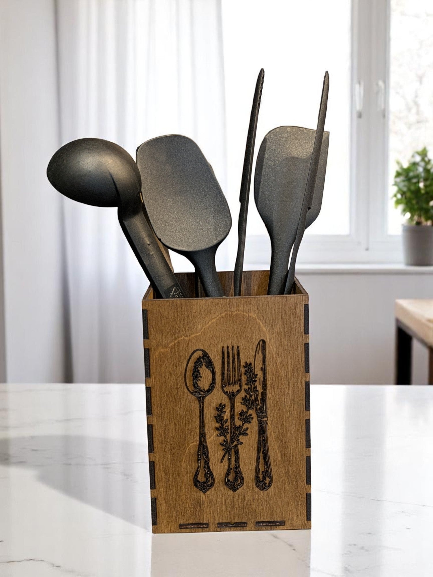 Tämä selkeälinjainen ja käytännöllinen keittiövälinelaatikko sopii täydellisesti esimerkiksi kauhojen, lastojen ja muiden arjen keittiövälineiden säilytykseen. Laatikko on valmistettu 3 mm paksuisesta koivuvanerista ja käsitelty ruskealla antiikkivahalla.