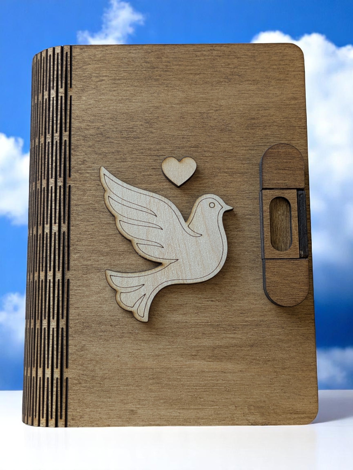 Tämä tyylikäs laserleikattu koivuvaneri-rasia on suunniteltu juhlaan, muistamiseen ja henkilökohtaisiin hetkiin. Kannen koristeena on siro kyyhkynen, joka symboloi rauhaa, toivoa ja rakkautta. Yläpuolella oleva pieni sydän tekee kokonaisuudesta herkän ja merkityksellisen.