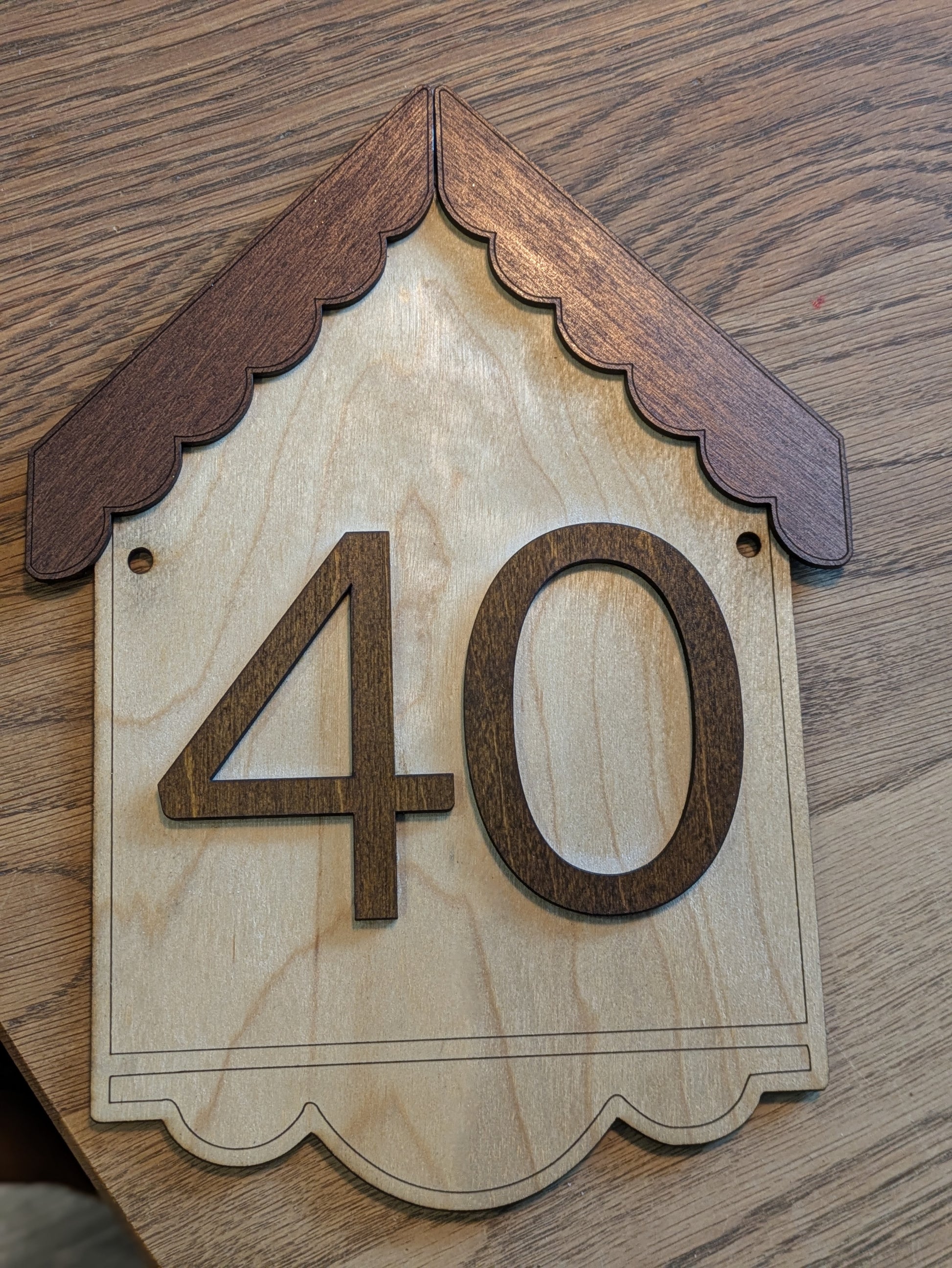 Mitat ovat noin 15,5 × 21 cm. Yläosa on koristeltu kattomuotoilulla ja numero(t) on kiinnitetty koholle taustasta.