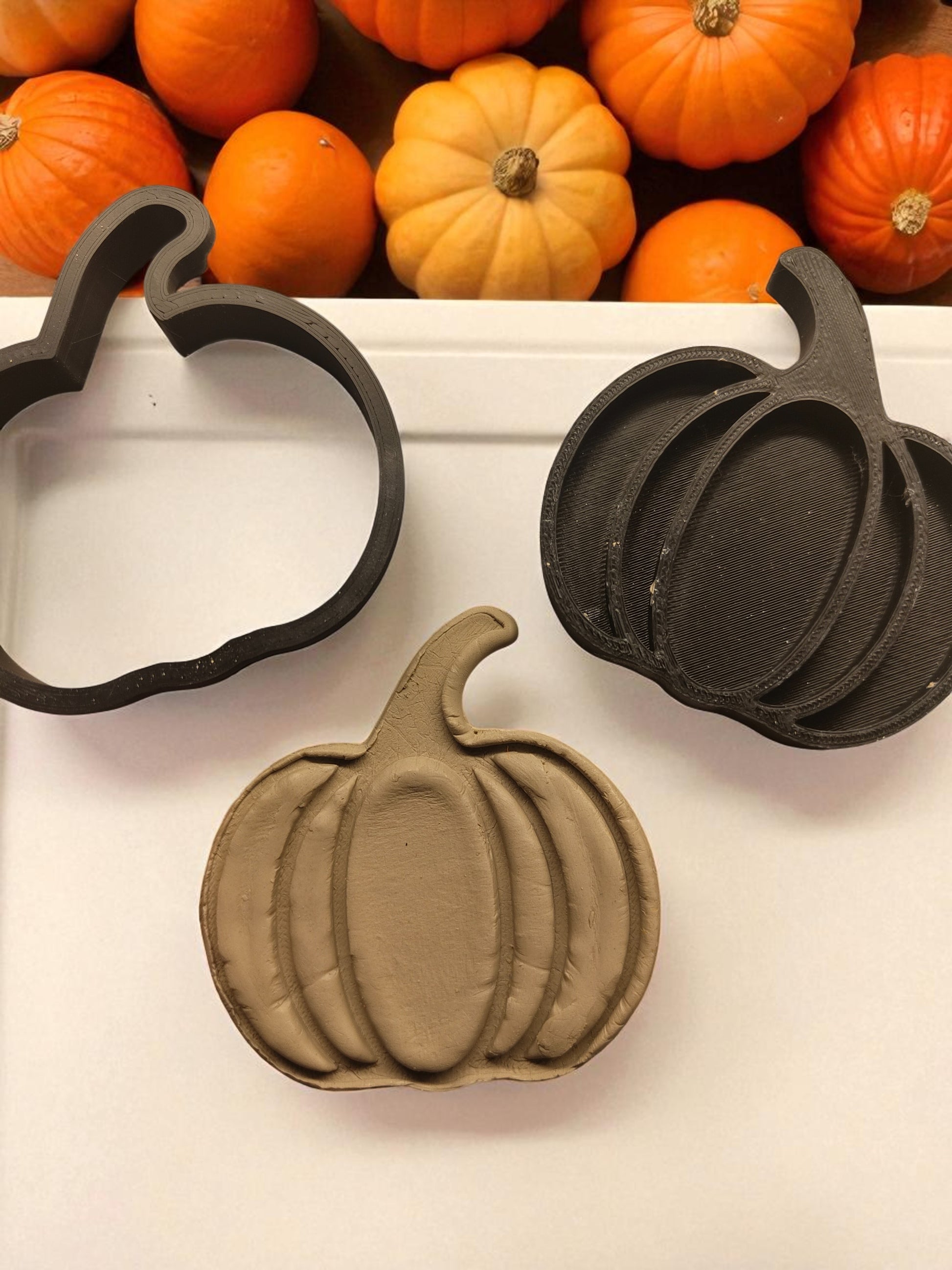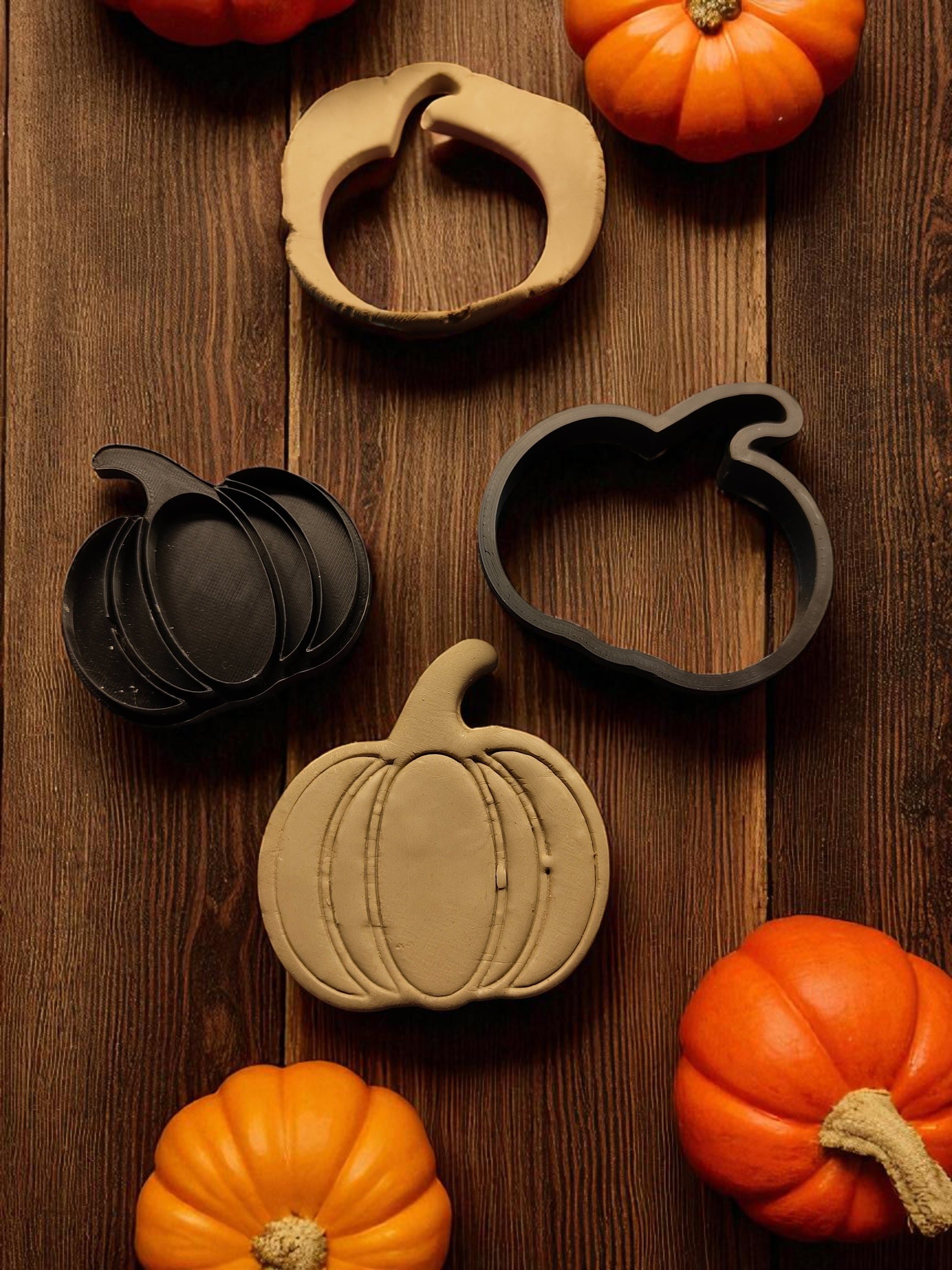 Kurpitsan muotoinen leikkuri ja stämpperi, joka sopii täydellisesti syksyisiin ja halloween-aiheisiin savitöihin ja askarteluun.