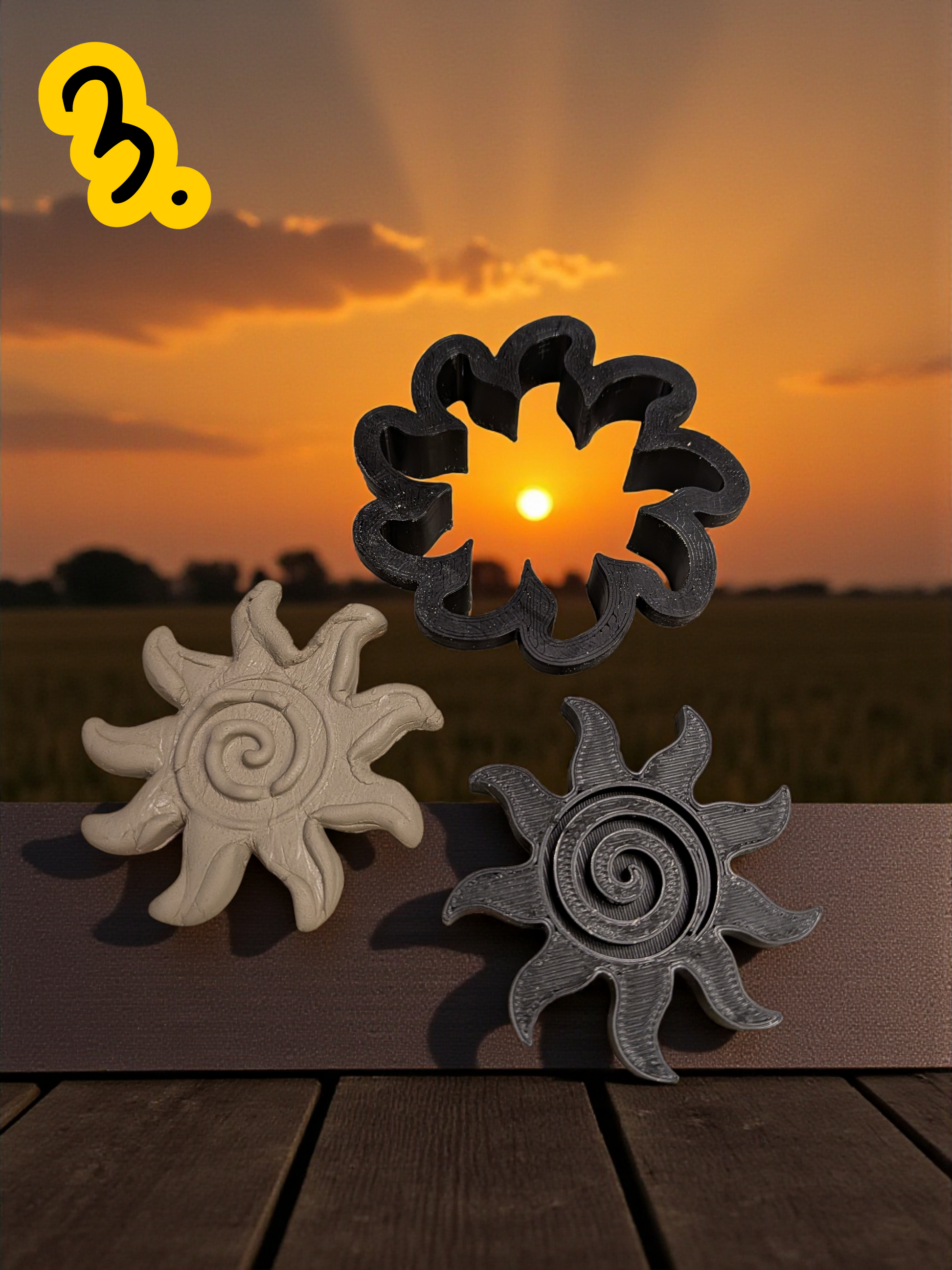 Aurinko-leikkuri-sarja sisältää monta erikokoista leikkuria, jotka toistavat säteilevän auringon muodon. Muodot sopivat monenlaisiin savitöihin – koruihin, laattoihin, koristeisiin ja tarjoilualustoihin.