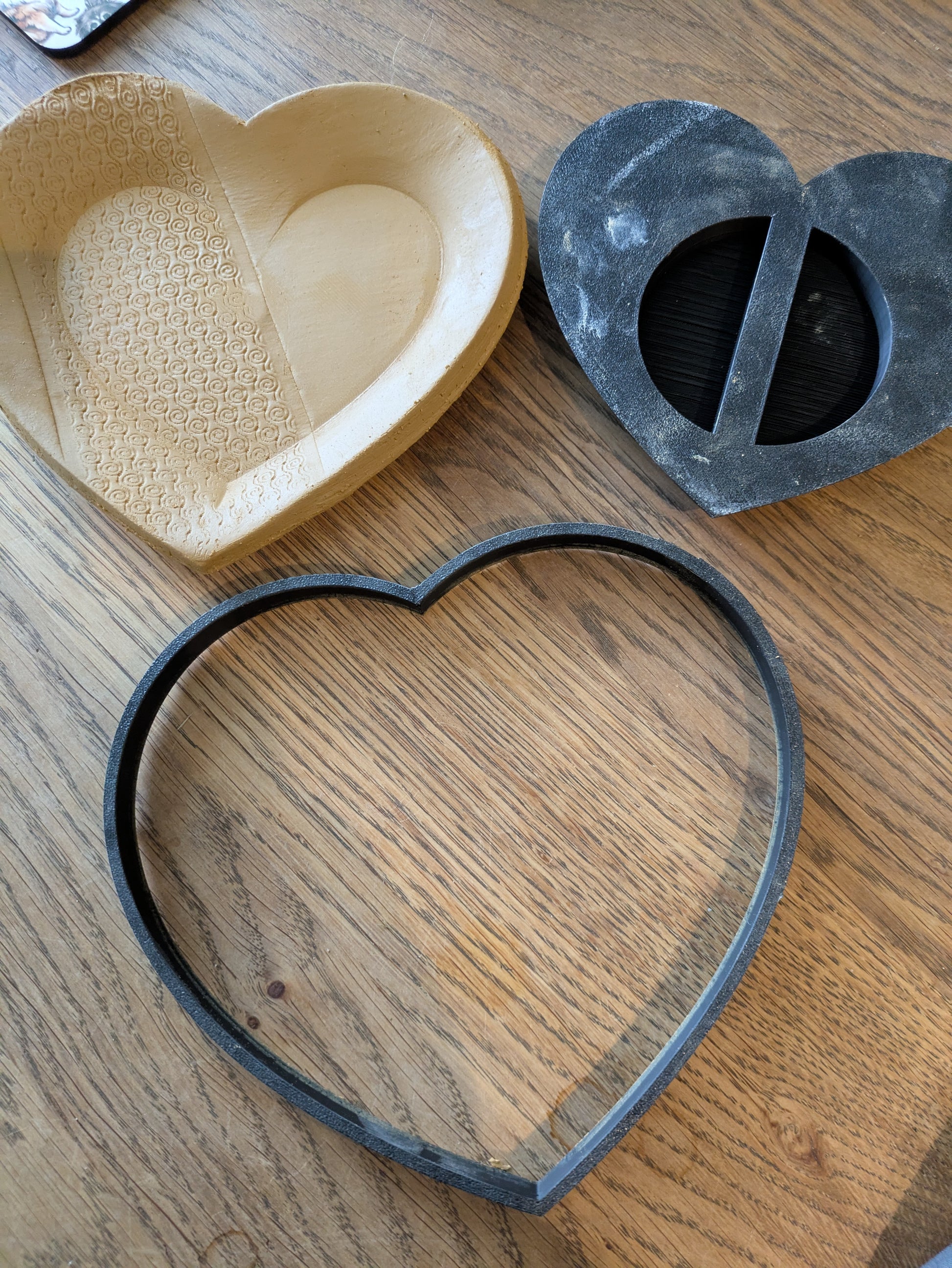 Setti sisältää: Ulkoreunamuotin (sydämen muotoinen kehys), jolla leikkaat kulhon ulkomuodon tarkasti. Painomuotin, joka antaa kulholle sisäsyvyyden ja mahdollistaa muodon painamisen tasaisesti. Kuvassa näkyvä valmiiksi tehty savimalli on esimerkki siitä, millaisen lopputuloksen tällä muottisetillä voi tehdä.