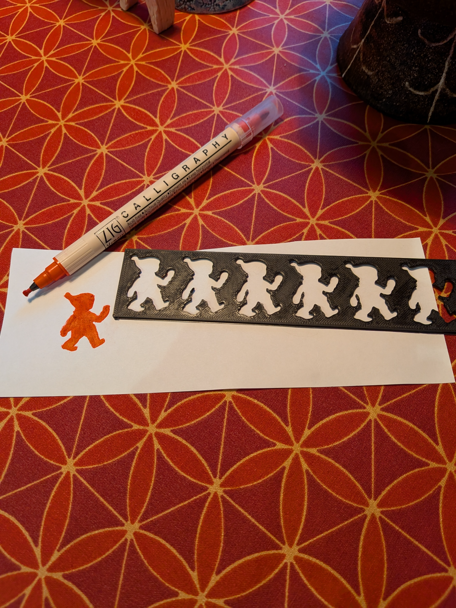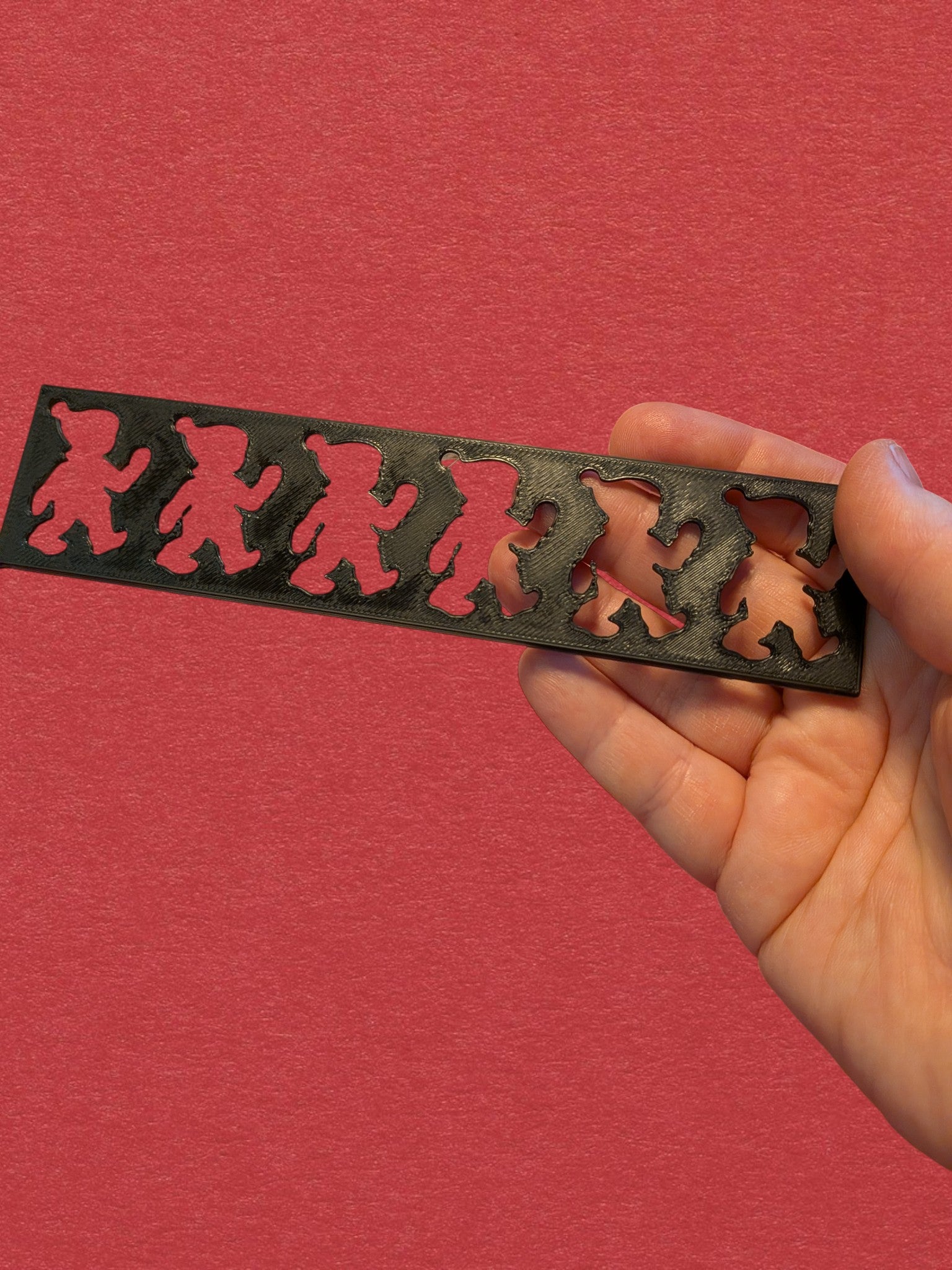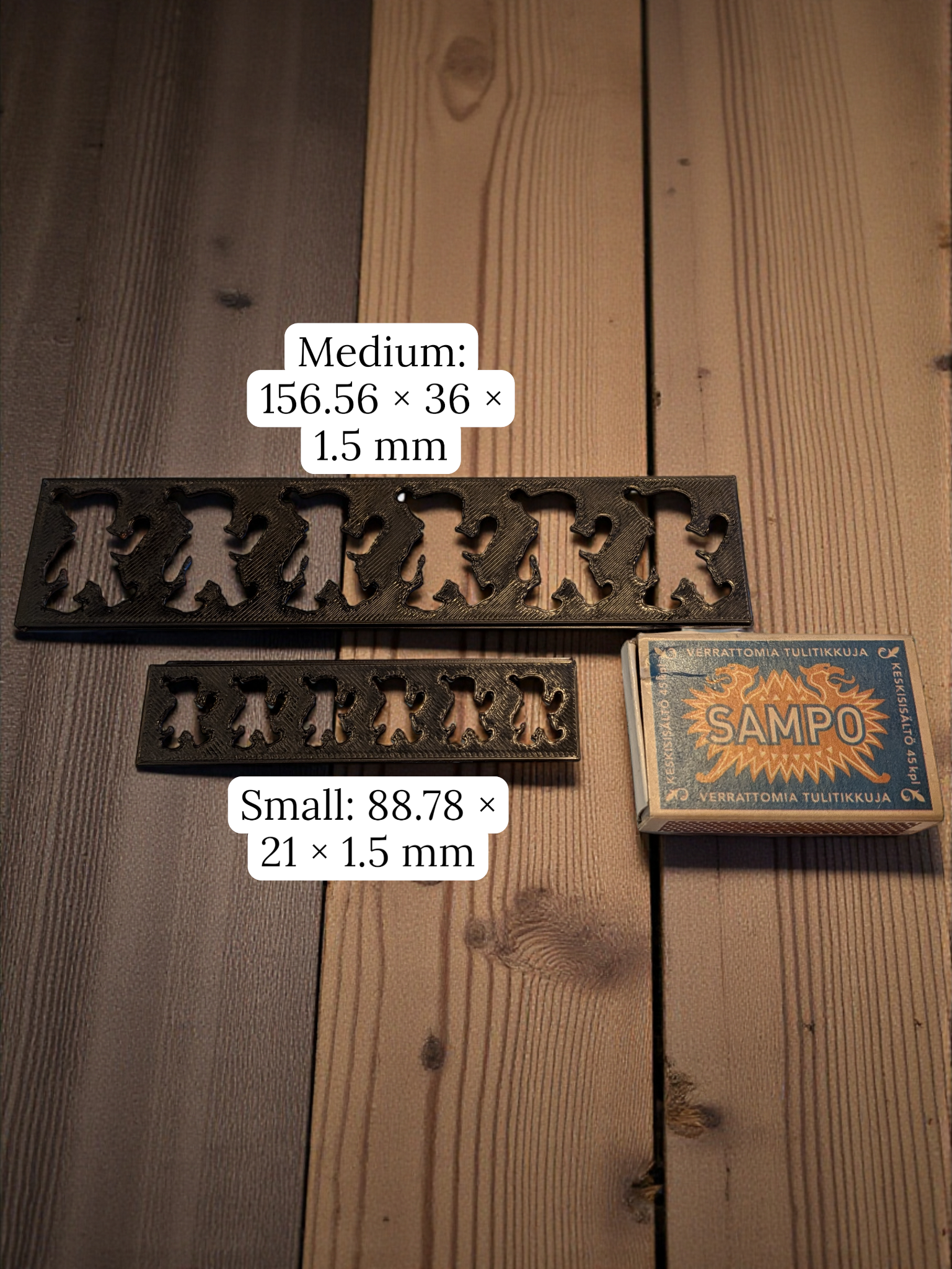 Tämä sabluuna sisältää kuusi perinteistä tonttua rivissä, kuvion jatkuessa tasaisena nauhana. Jokainen sabluuna valmistetaan tilauksesta 3D-tulostamalla PLA-materiaalista. Väri voi vaihdella materiaalierän mukaan. Saatavilla on kolme eri kokoa, jotta löydät omaan projektiisi sopivan vaihtoehdon.