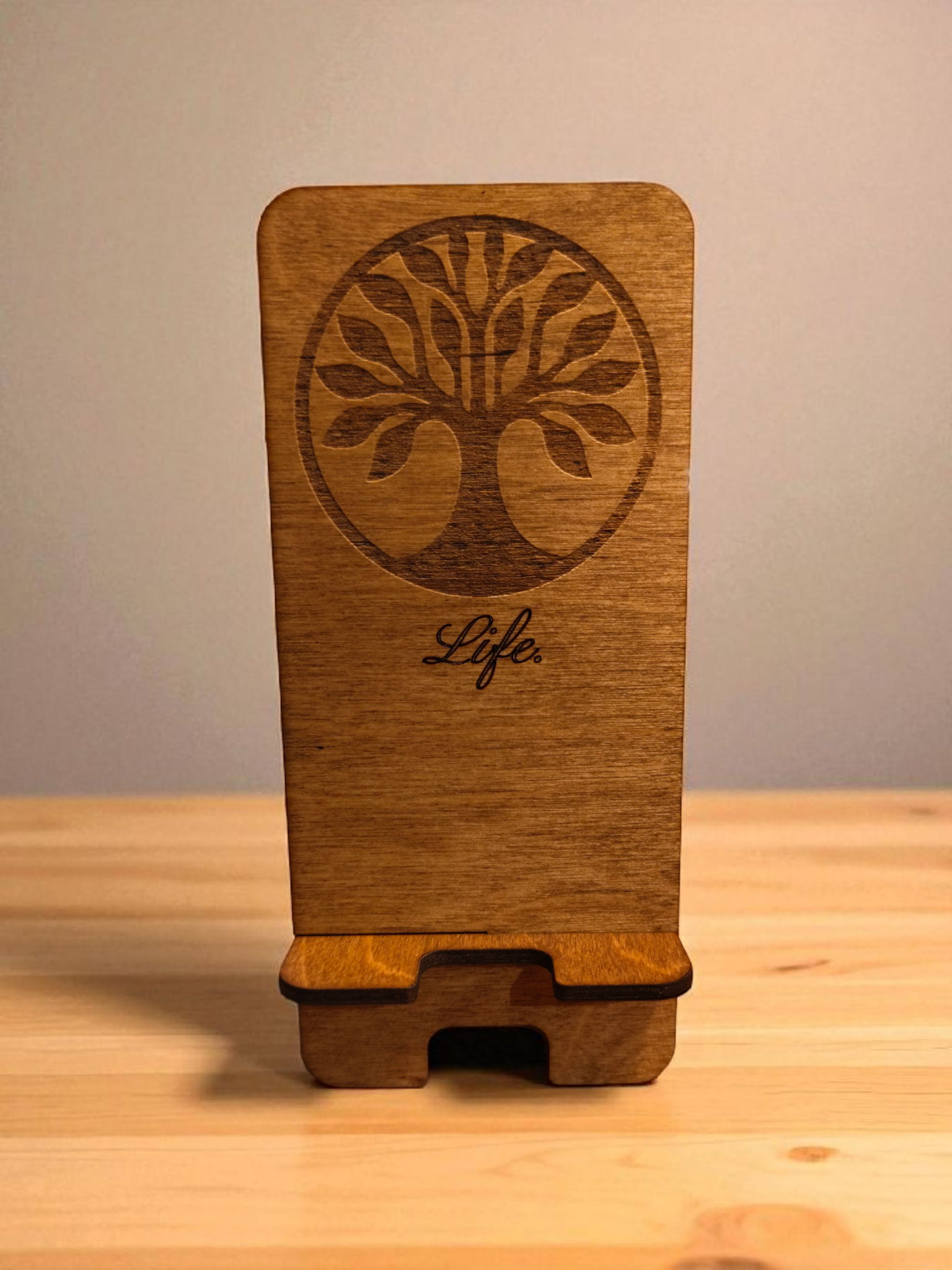 Pidä puhelimesi siististi esillä ja latauksessa tällä upealla puhelintelineellä, jossa on kaiverrettu elämänpuu-symboli ja sana Life. Telineen lämmin ruskea sävy on saatu aikaan antiikkivahalla, joka korostaa kauniisti koivuvanerin luonnollista pintaa.
