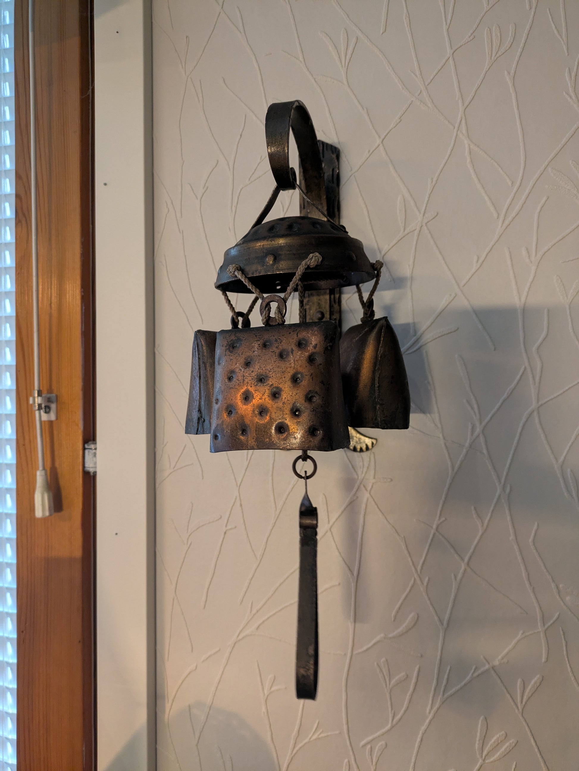 Kauniisti patinoitunut vanha tuulikello, josta lähtee ihanan heleä ja rauhoittava ääni tuulen tai pienen napautuksen voimasta. Rungossa näyttävät niittikoristeet ja vahva ripustuslenkki, jonka avulla voit kiinnittää kellon seinälle tai ulos suojaisaan paikkaan.