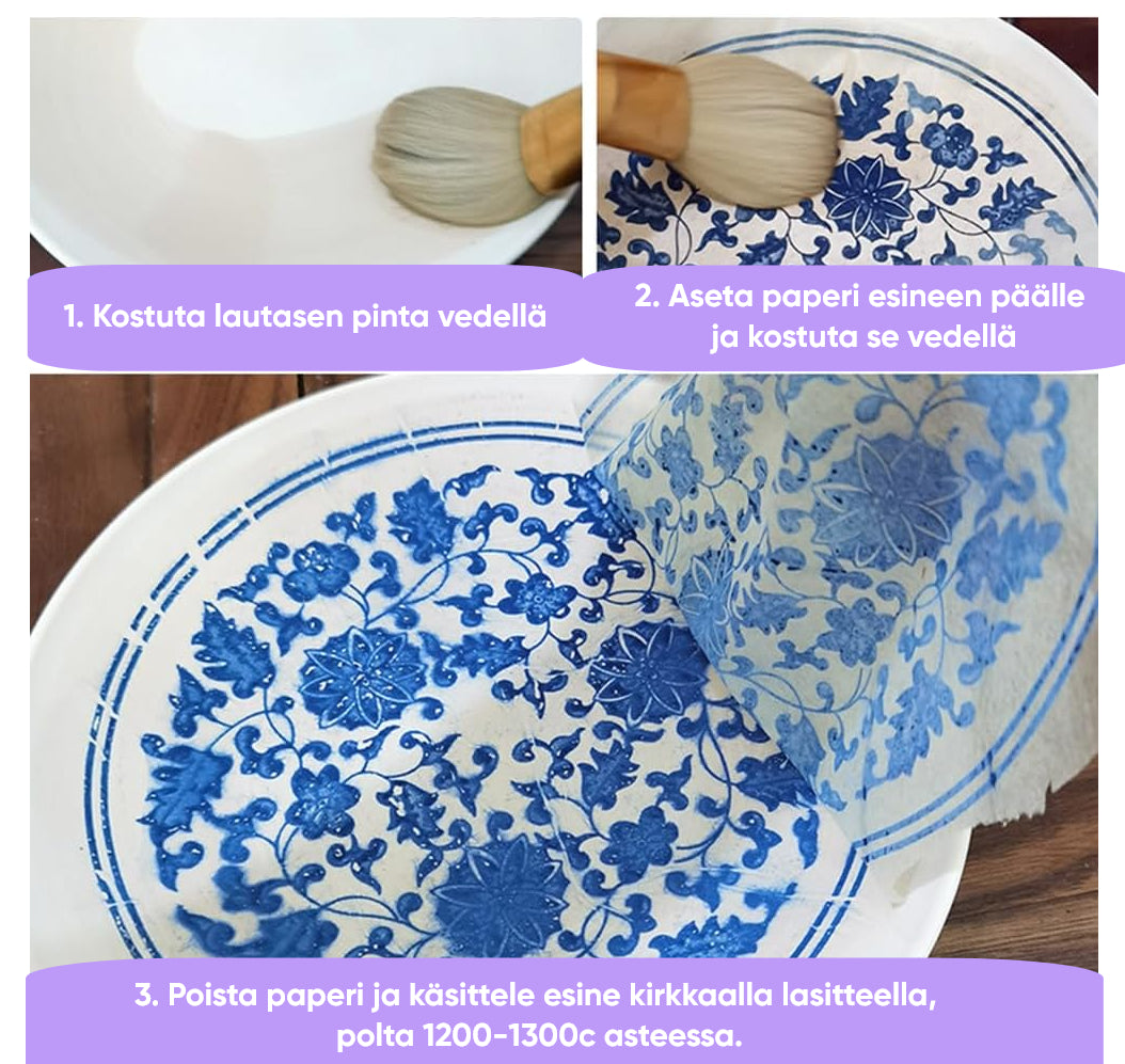 Jokainen arkki sisältää kauniin sinisen kuosin, joka siirtyy saven tai raakapoltetun posliinin pintaan helposti. Paperi soveltuu erityisesti kivitavaralle ja posliinille, ja se kestää 1200–1300 °C polton.
