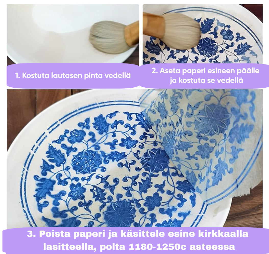 Siirtopaperi on helppo kiinnittää vedellä, ja kirkaslasituksen jälkeen kuvio jää kauniiksi ja kestäväksi. Sopii posliinin, polttamattoman keramiikan, lautasten, maljakoiden ja muiden sileiden pintojen koristeluun. Polttolämpötila 1180–1250 °C.