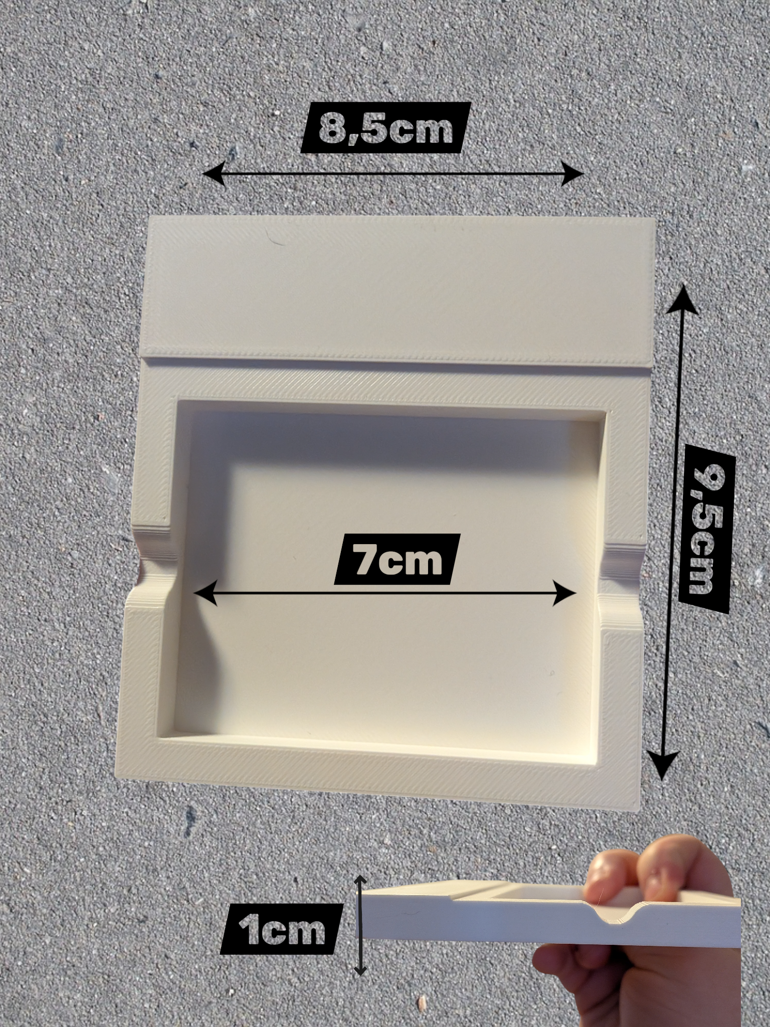 Pidikkeen ulkomitat ovat noin 8,5 cm leveys, 9,5 cm syvyys ja 1 cm paksuus.