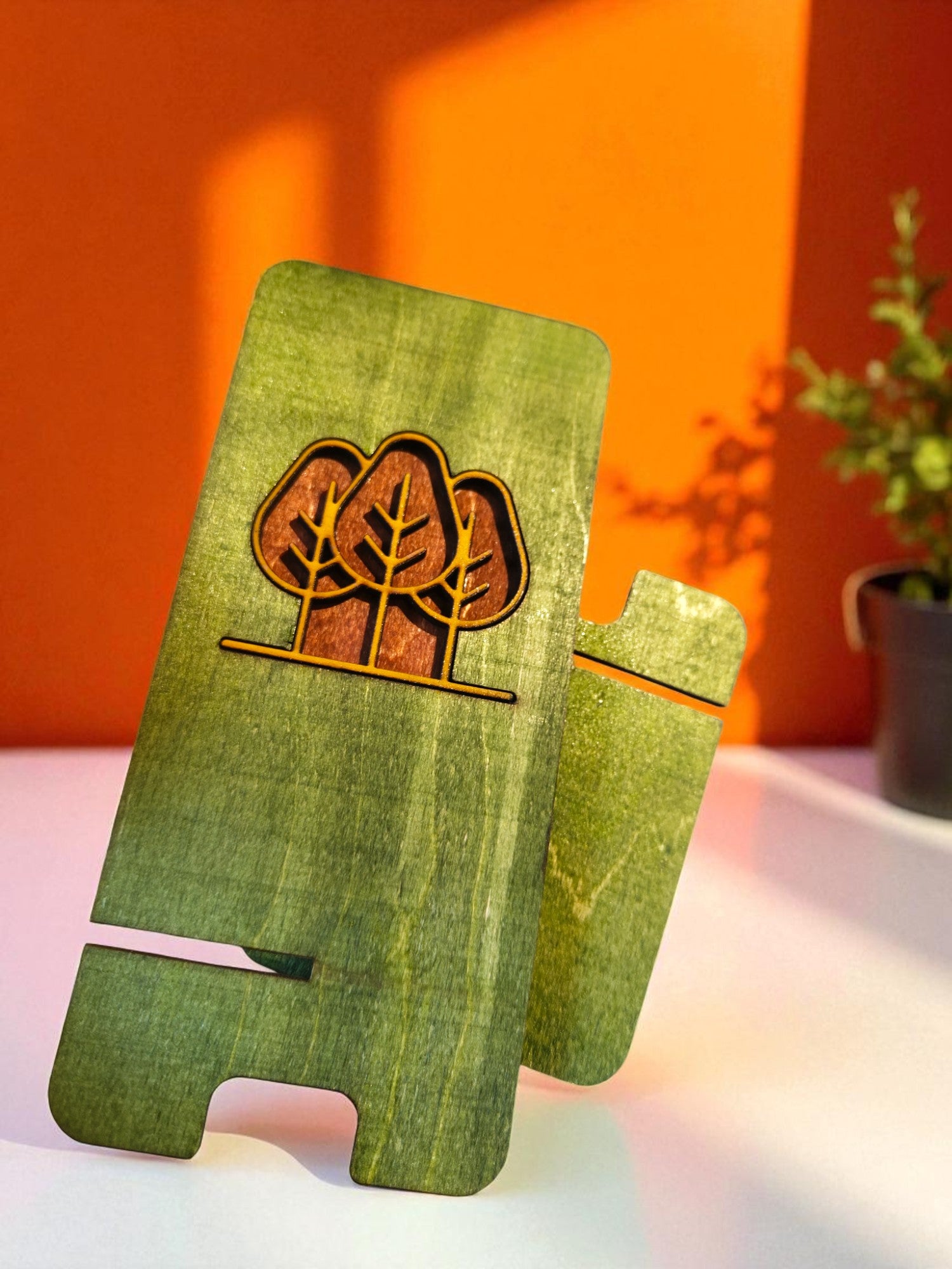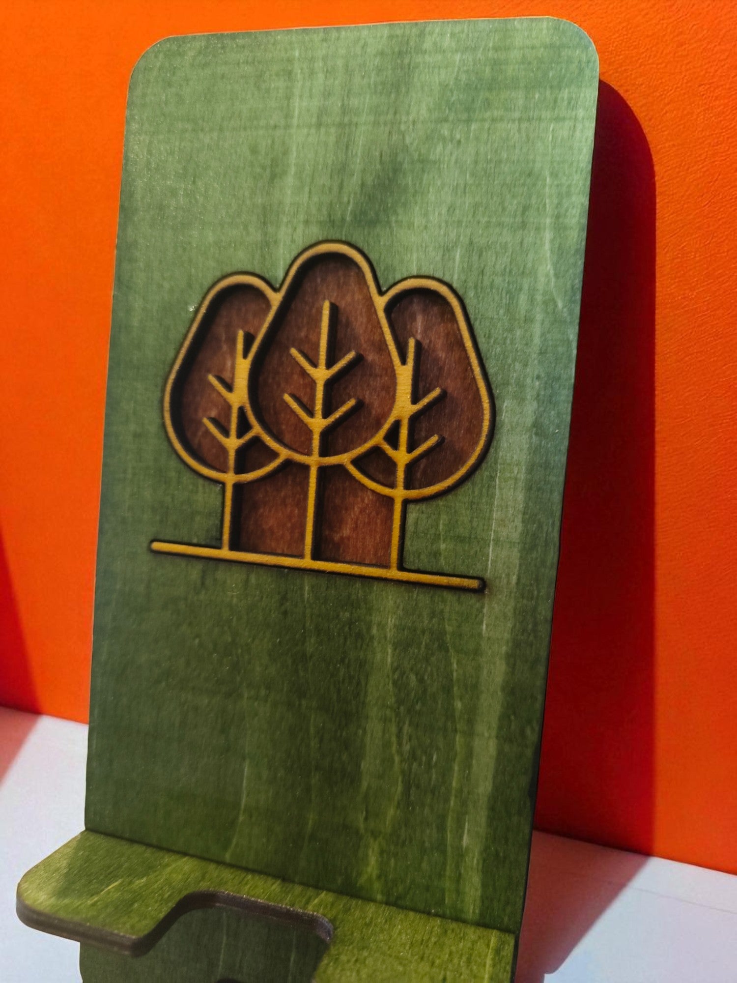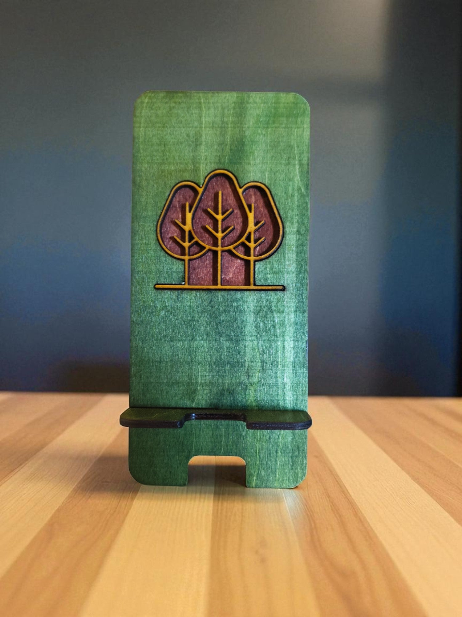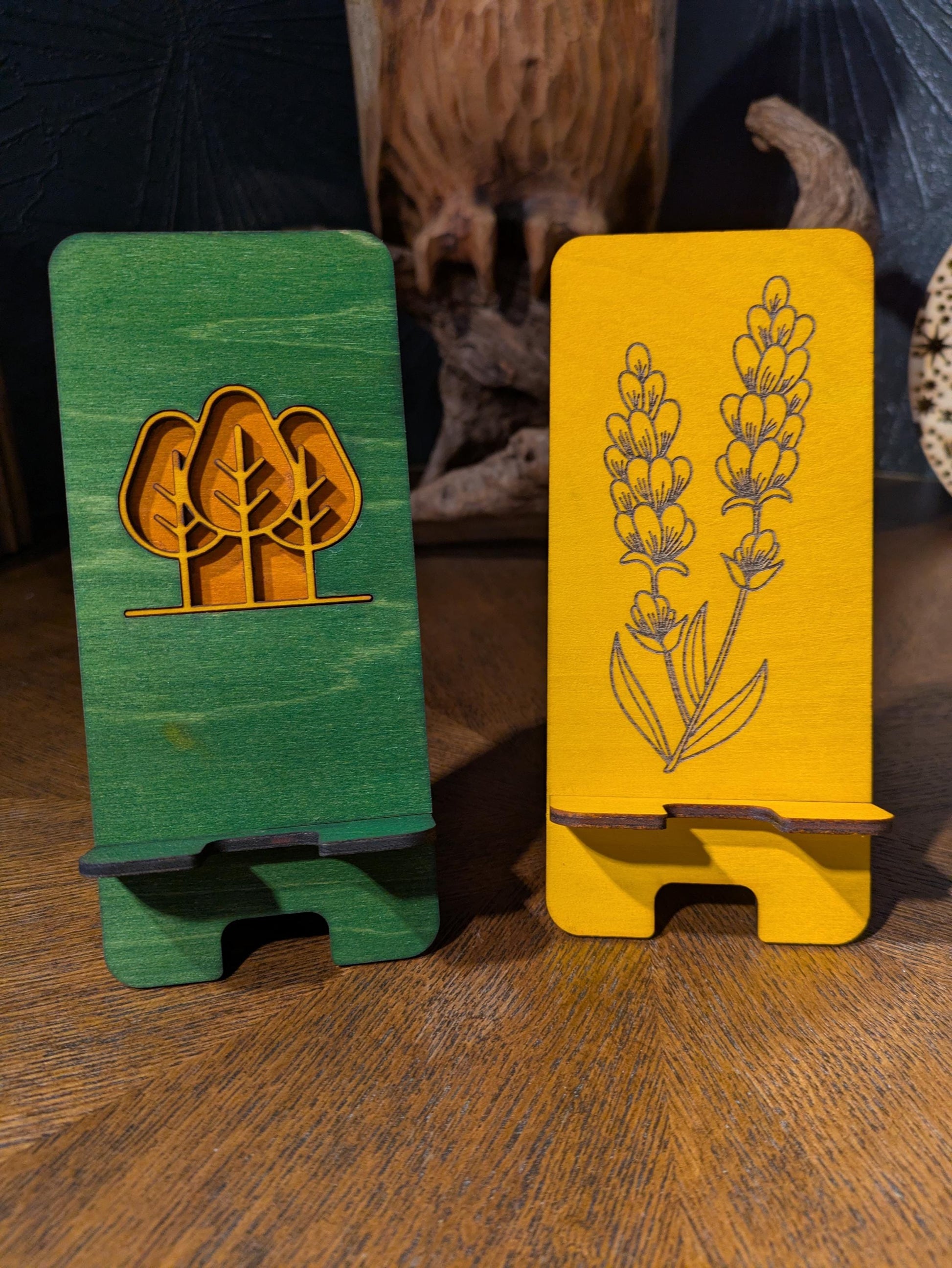Puinen puhelinteline – Luonnon inspiroima laserleikkausteline – Metsä- ja kasvitieteelliset mallit – Käsintehty ja petsattu – Maalaismainen ekolahja