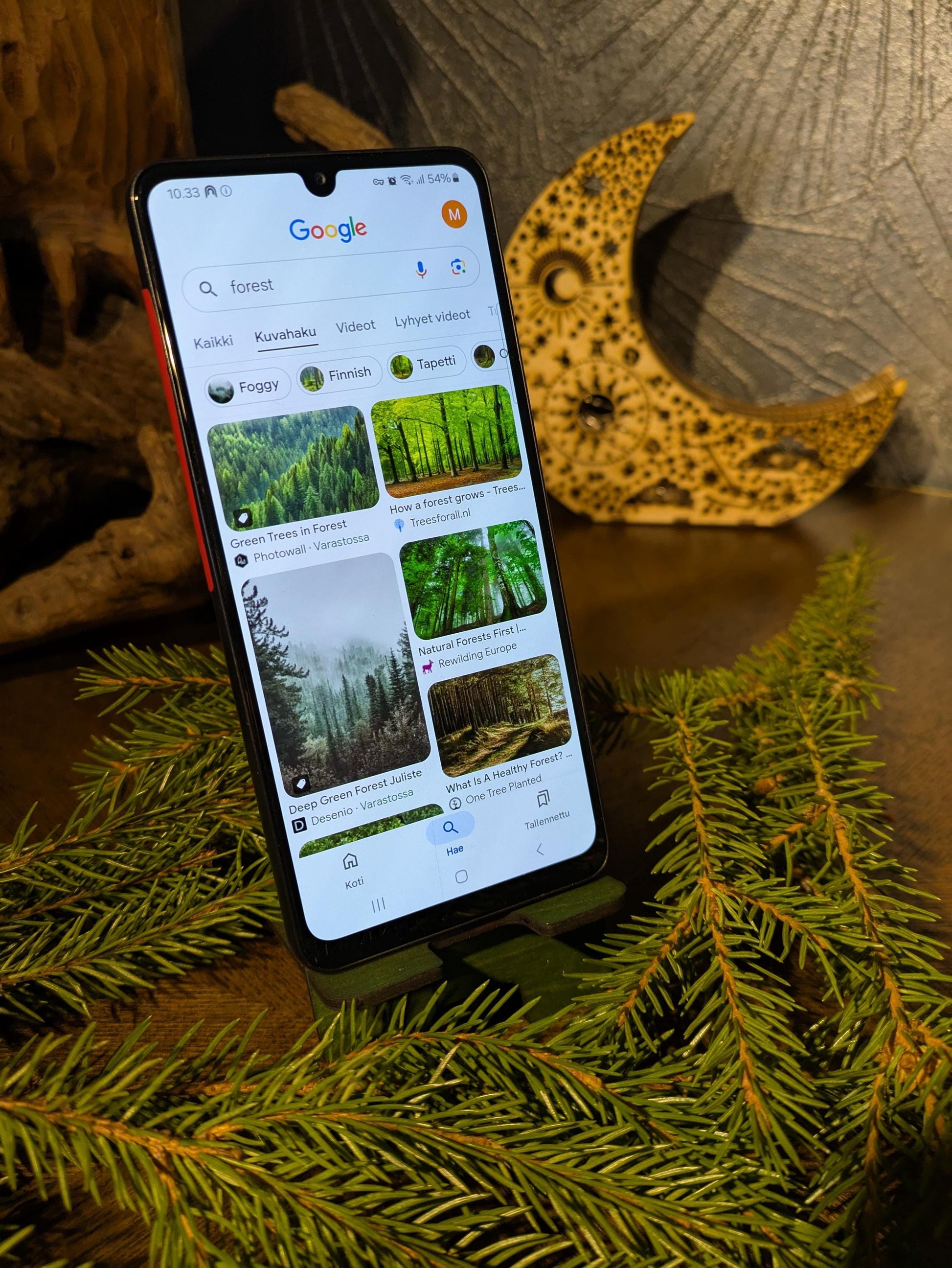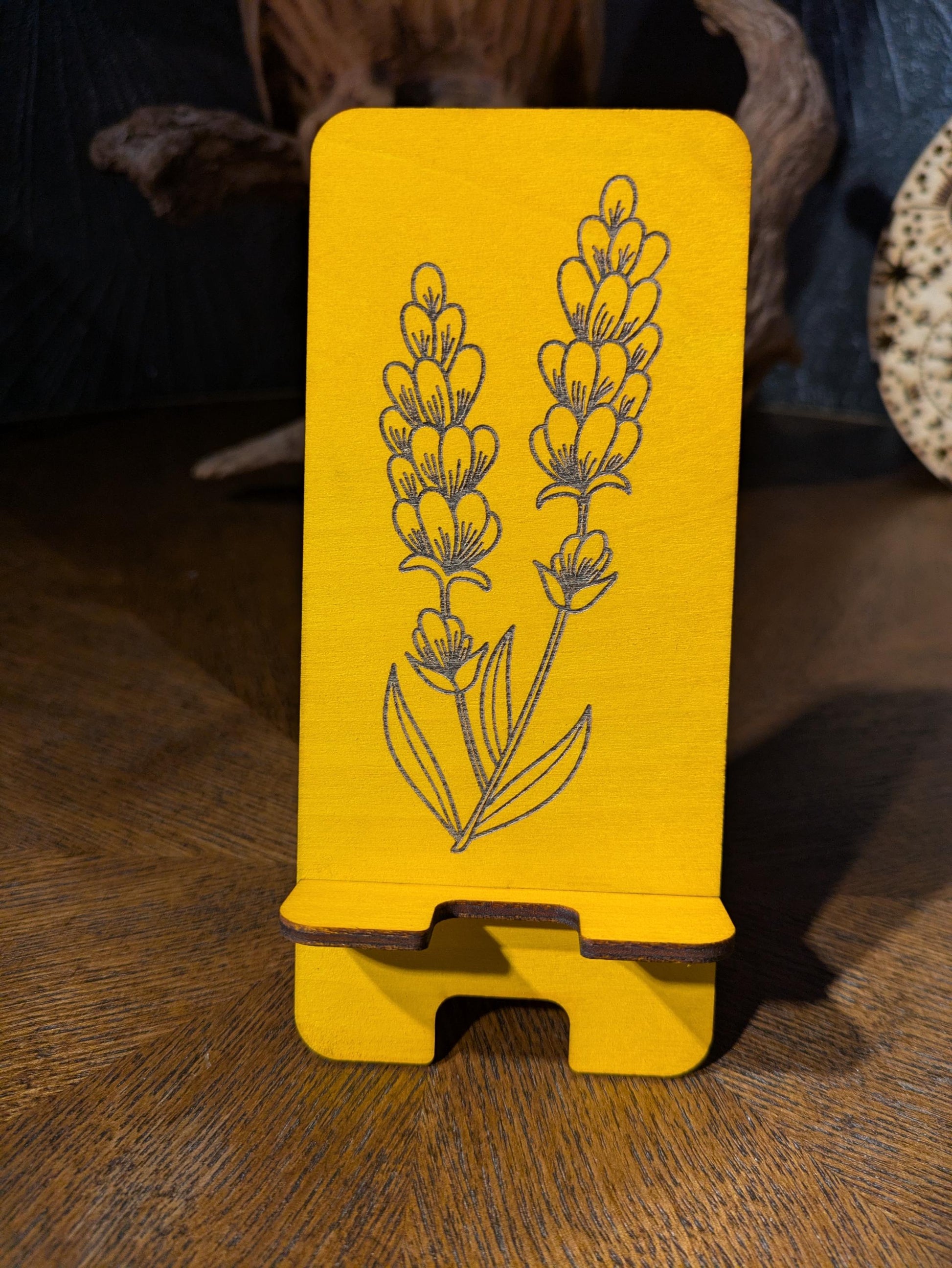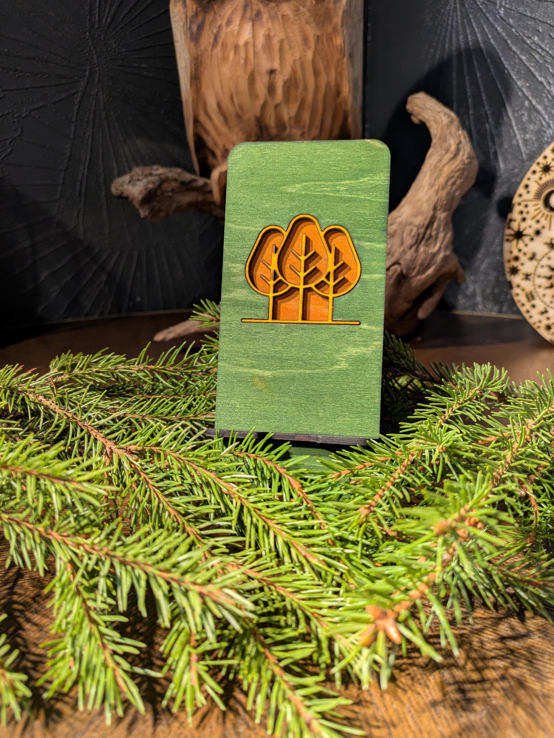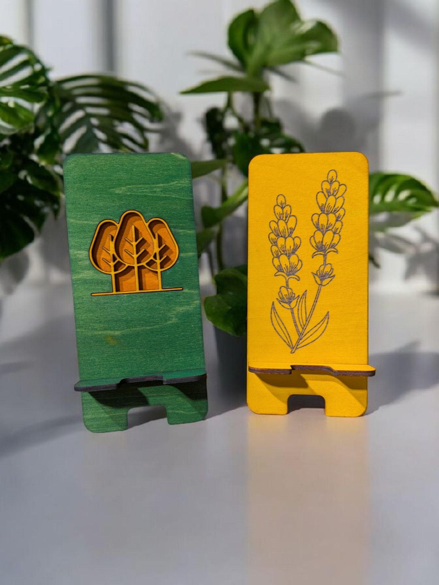Puinen puhelinteline – Luonnon inspiroima laserleikkausteline – Metsä- ja kasvitieteelliset mallit – Käsintehty ja petsattu – Maalaismainen ekolahja